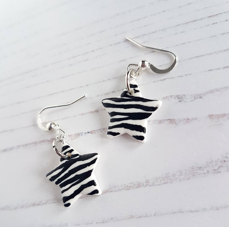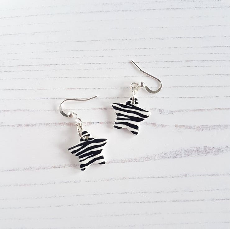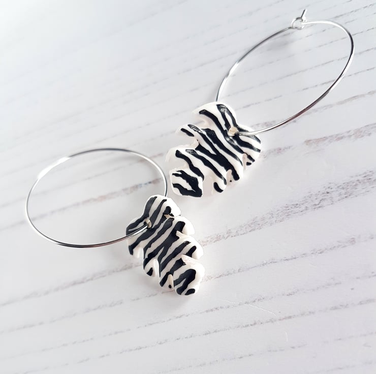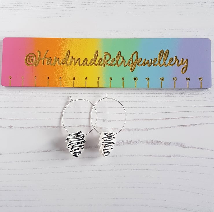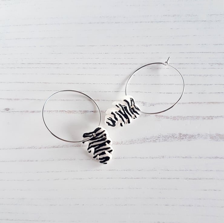 This collection is a gorgeous black and white Zebra pattern, choose from either tropical leaves on hoops or stars on fish hook style!