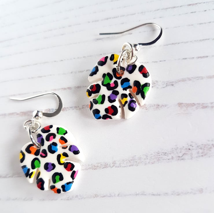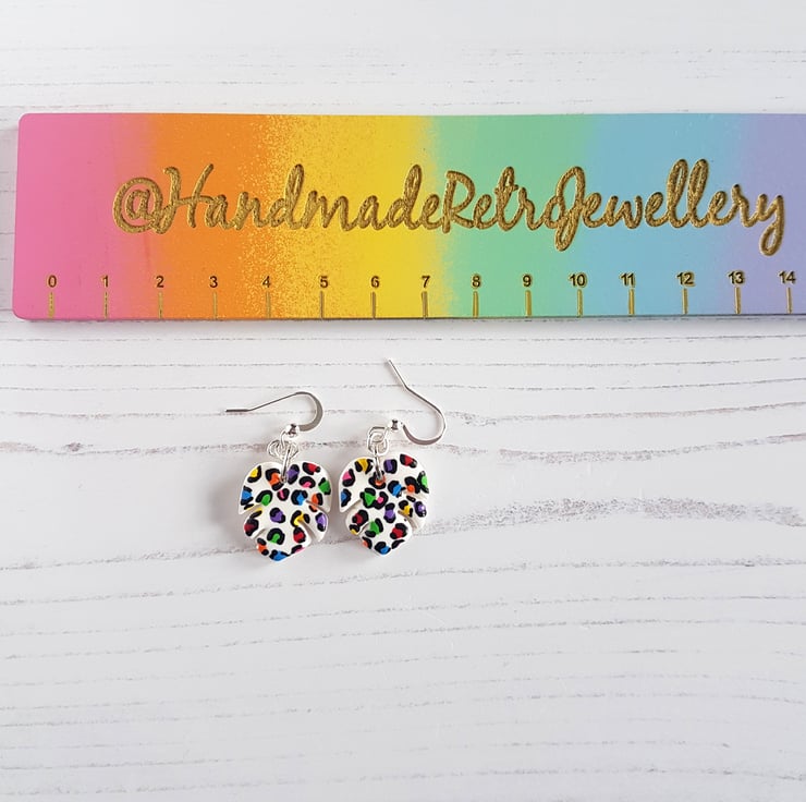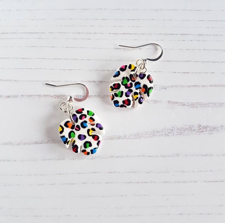 This is a listing for a bright rainbow coloured leopard print on white tropical leaves, on fish hook style fixings!