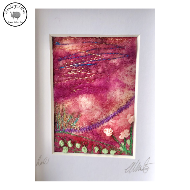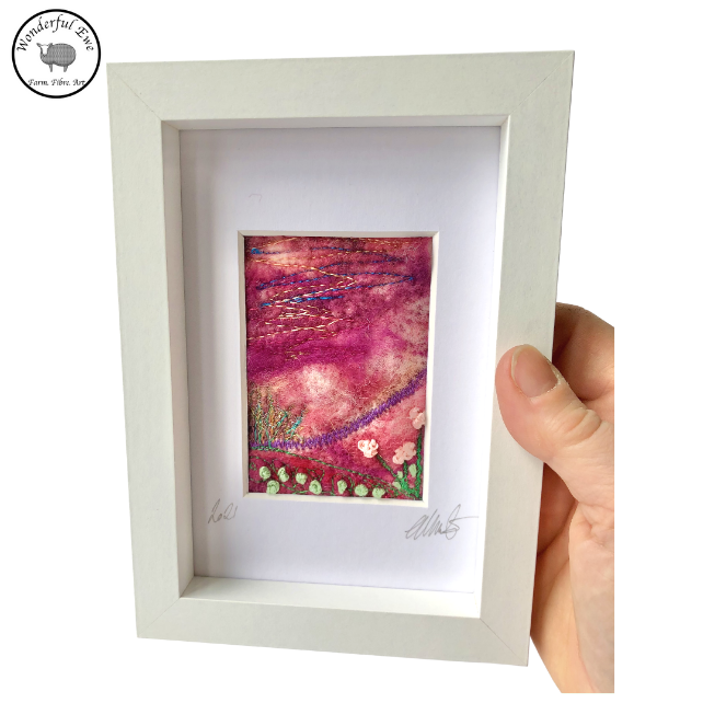 This miniature felt painting is full of texture and fibres. It has shades of pink, brown, purple, and orange wool for the sky and hills.