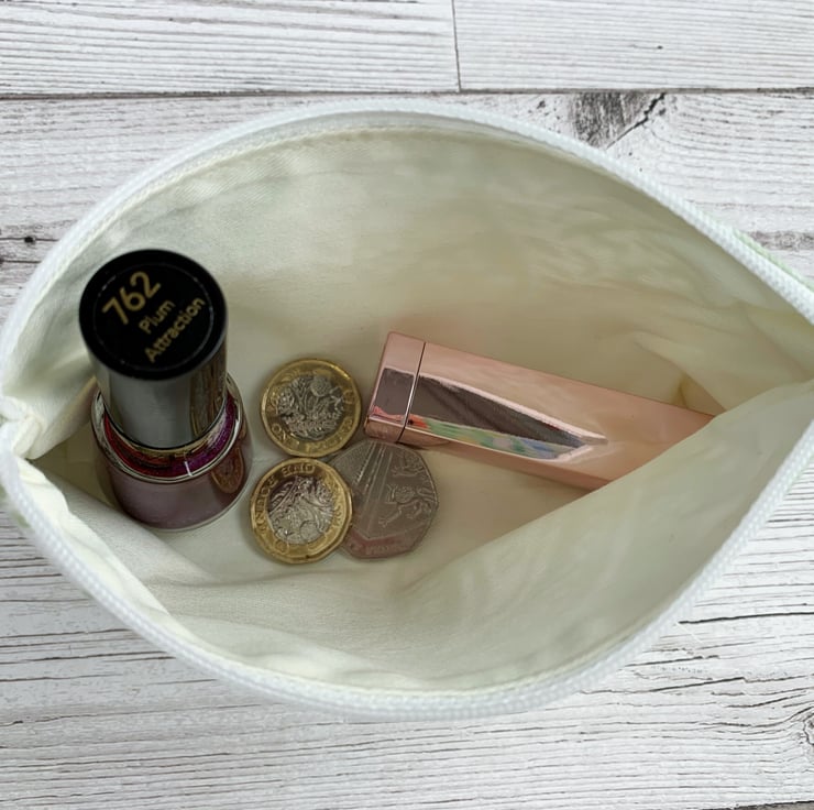 A large coin purse with a pale green and white Paisley pattern. This useful large-sized purse is made from lovely soft fabric with an attractive print pattern. The pattern features a white Paisley and floral pattern on a pale pastel green background. The coin purse fastens with an off-white zip and is lined with cream fabric. The base of the bag is boxed to give lots of space inside.