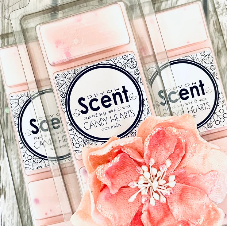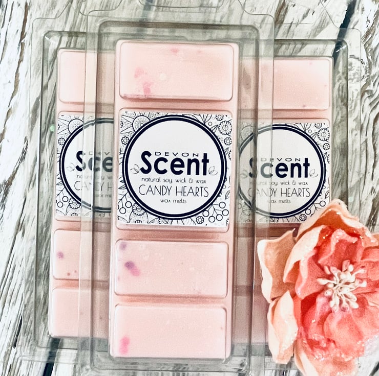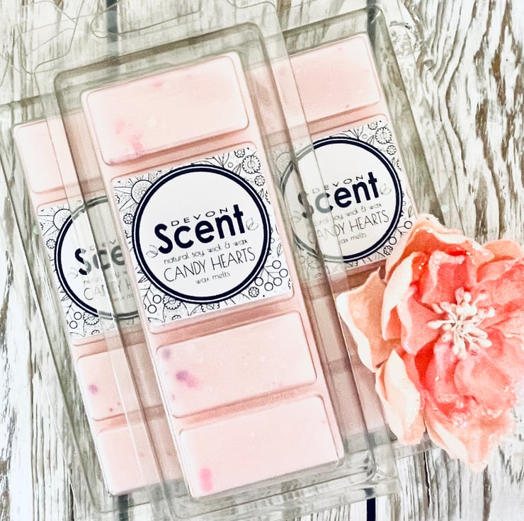 The scent from our Candy Hearts Snap Bar Soy Wax Melts have a sweet, powdery fragrance with fruity notes of raspberry, plum and peach refreshed by orange and lemon on a sweet vanilla base.
