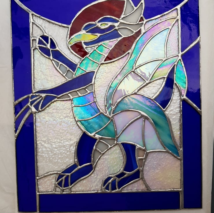 The Dragon is made using shades of blue, red, and a textured white glass.