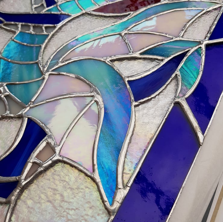 The Dragon is made using copper foil technique where each piece of glass is cut, the edges ground, the copper foil is added, and then the pieces are soldered together and then washed and polished.