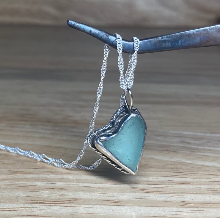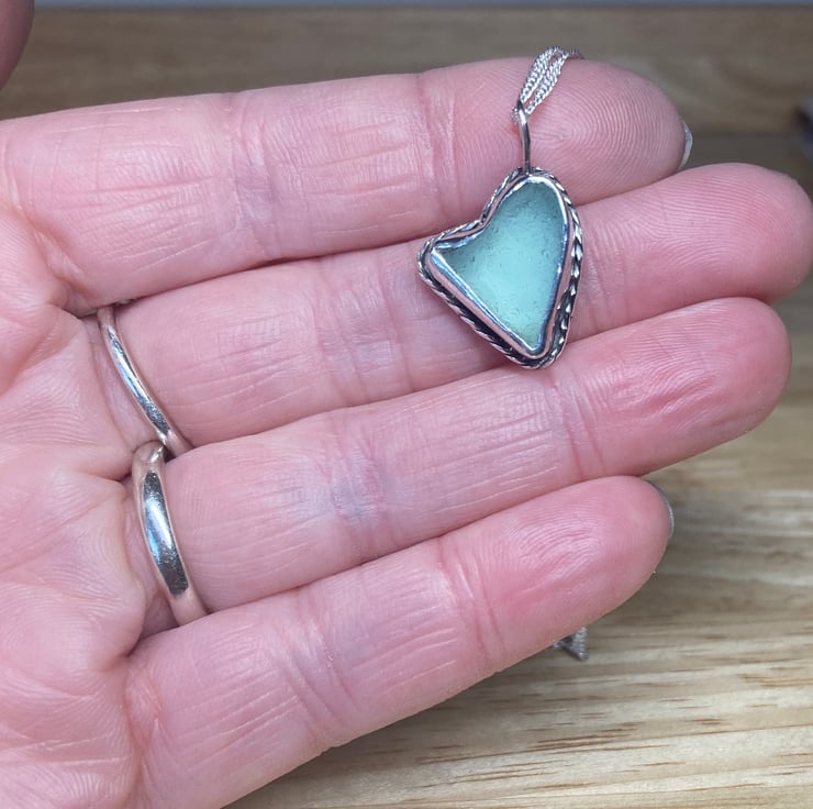 Stunning heart shaped light teal-grey piece of welsh sea glass collected from a beach in North Wales. Handset in fine and sterling silver with a rope detail frame. This gorgeous pendant hangs on a sterling silver 1.5mm curb chain and is 18’’ in length