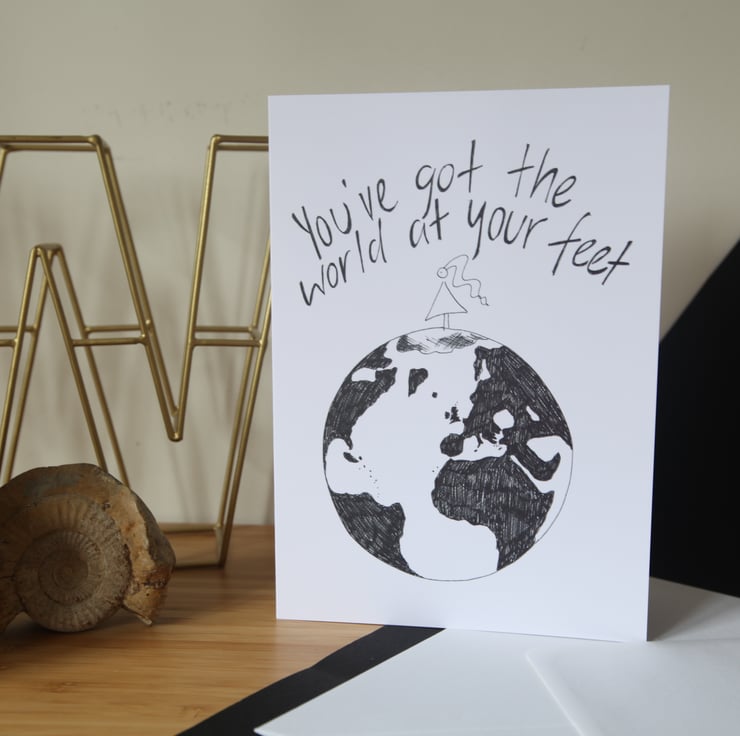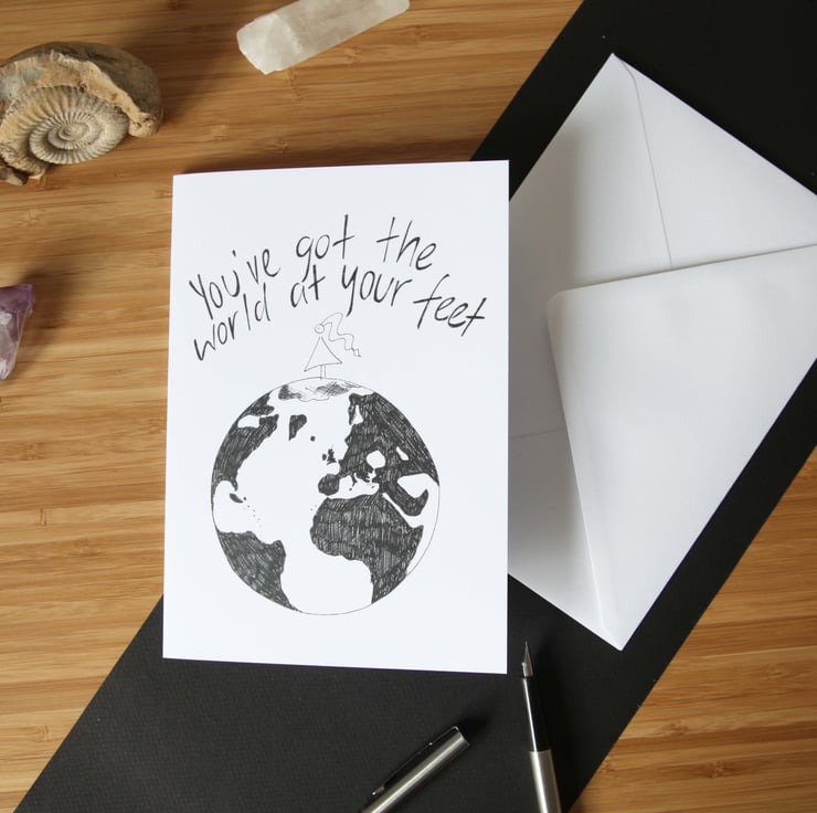 This uplifting card for that girl in your life, with a little cartoon of a girl on top of the world, with a quote saying "You've got the world at your feet"