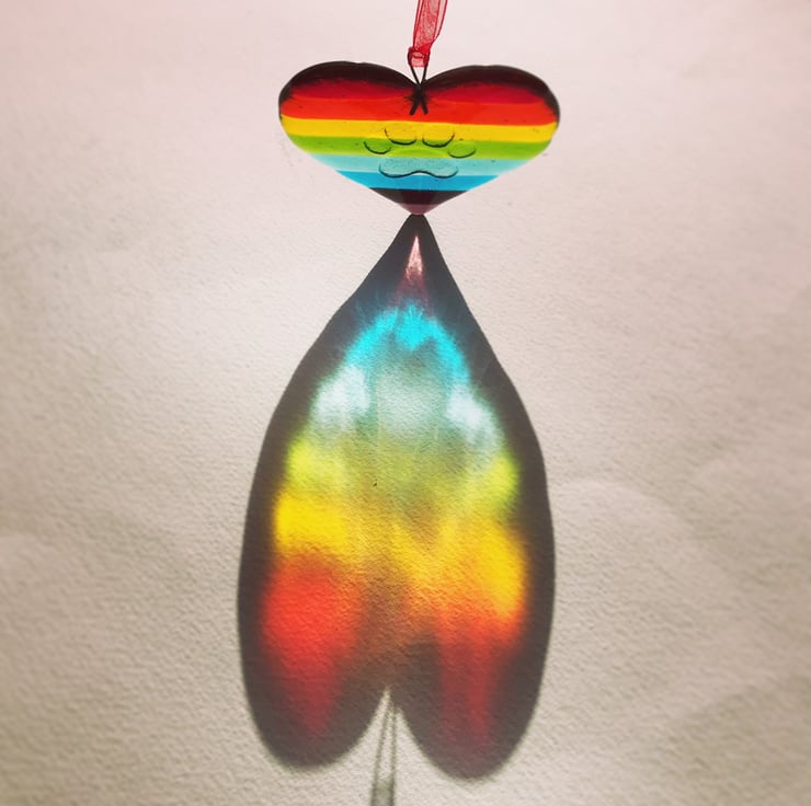 This colourful glass rainbow heart is so vibrant as it casts the most beautiful rainbow shadow and it has a paw print embossed into the back of the piece.