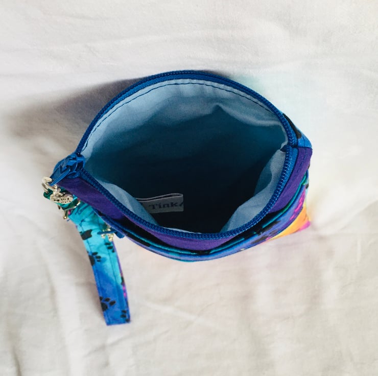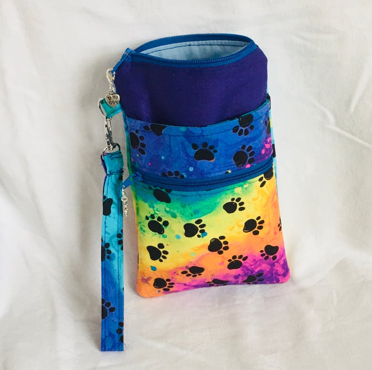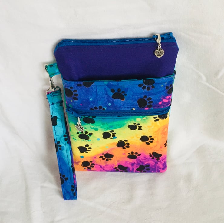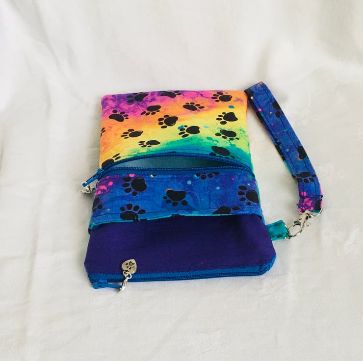 This wristlet zip pouch comprises a large zip compartment of the main body, with the addition of two extra pockets on the front, one a slip pocket and an additional zip pocket and finished with a detachable wrist strap. Made in good quality cotton with paw prints on a rainbow background and additional plain cotton for part of the main body and lining. Finished with zipper and zip pull charms. Having the clip wrist strap.