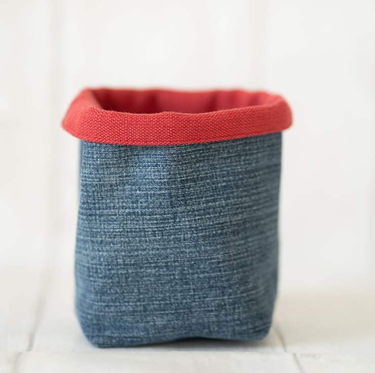 Made from repurposed denim, the tub is lined with a lovely deep red textured canvas type fabric. The co-ordinating embroidered circle on the front is also repurposed and provides a lovely splash of colour.