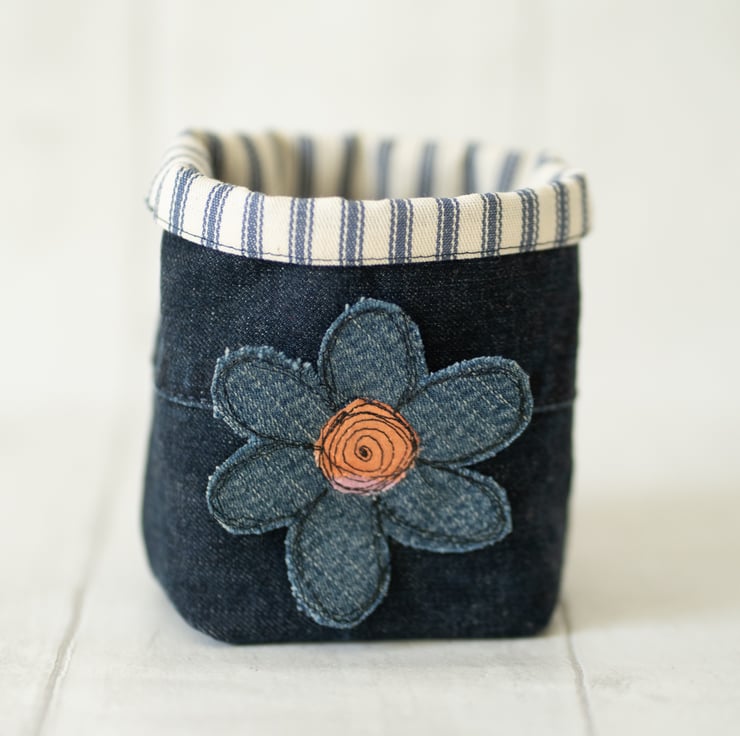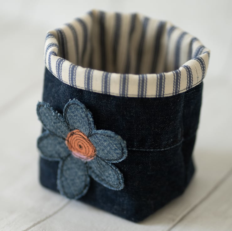 Made from repurposed denim, the tub is lined with a sturdy cotton ticking that gives the piece a utilitarian feel A denim flower with an orange/pink silk centre attached to the front gives the tub a cheerful vibe! An existing seam on the denim, that runs around the tub as well as topstitching, also adds detail and interest.