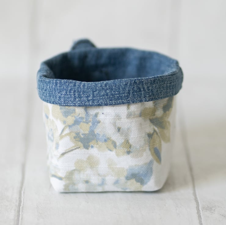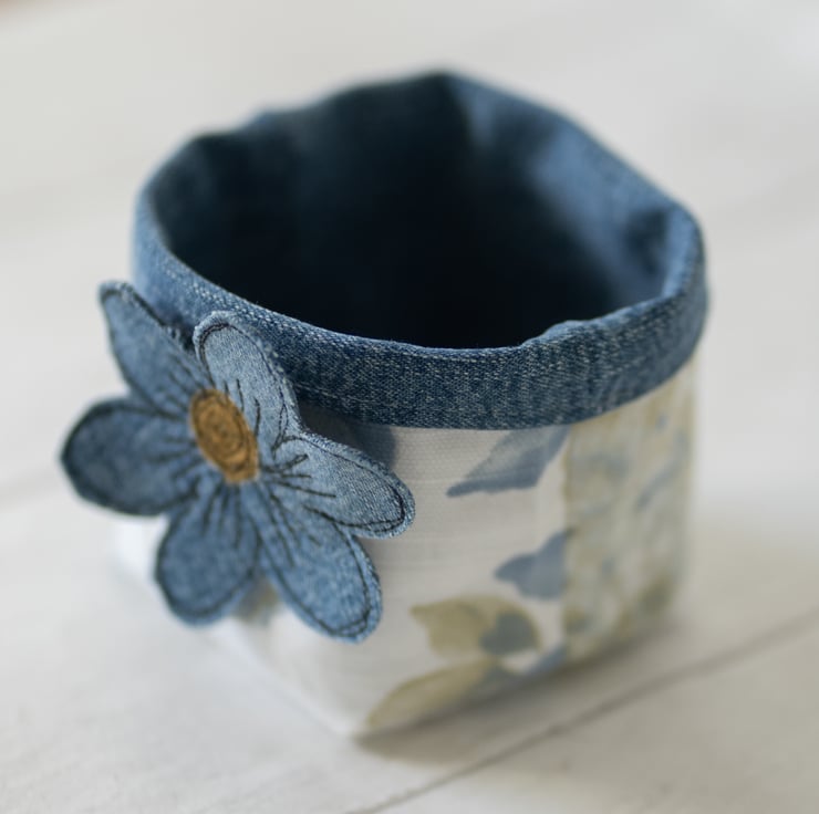 Made by Prestigious Textiles this 100% cotton outer fabric features hydrangea; the tub is lined with a repurposed denim. An embroidered denim flower finishes it off, giving the little tub a cheerful vibe!