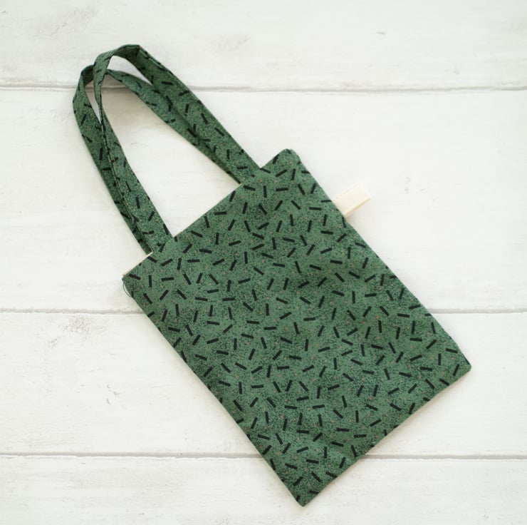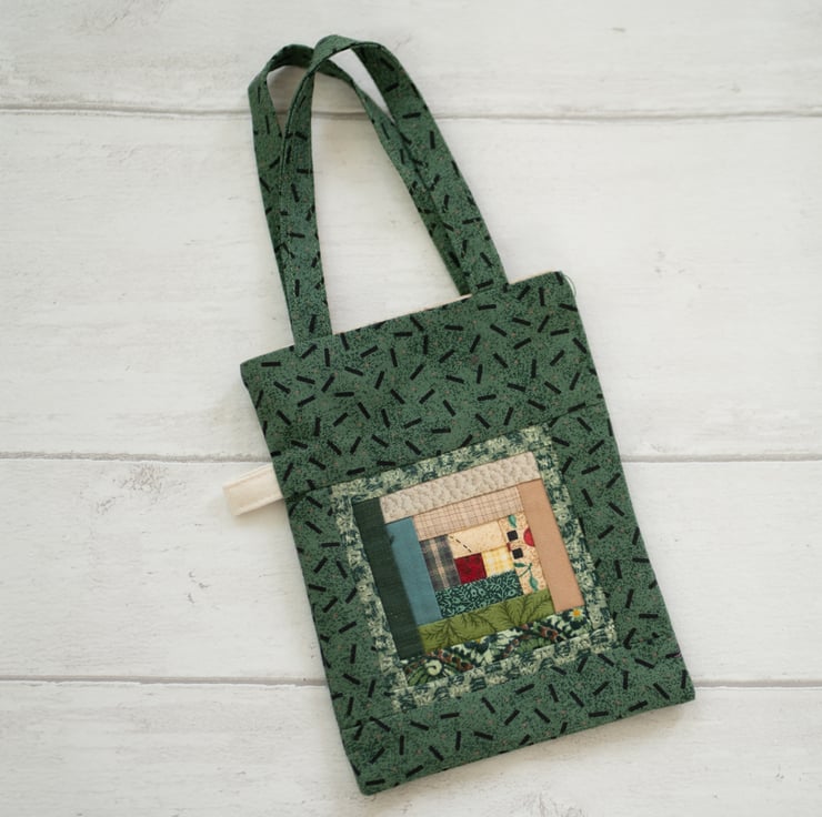 This gift bag features a centre of a patchwork in traditional "Log Cabin" design. It is perfect as a gift bag and could be used by the recipient afterwards. (It really is a "green" bag!)