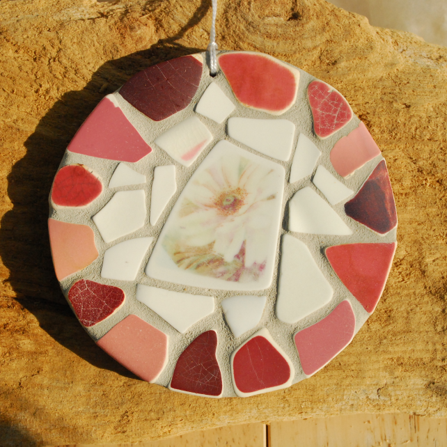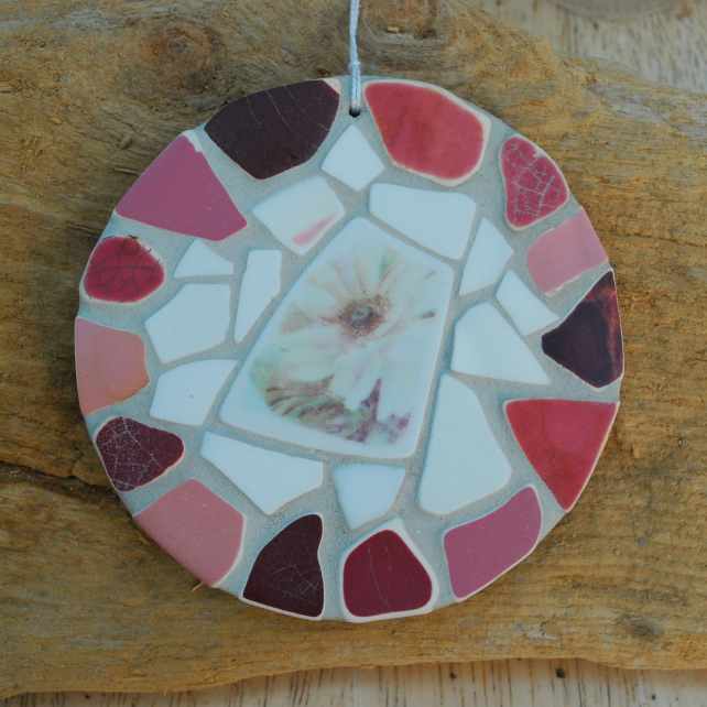 One of the lovely things about beach pottery is that it comes from many periods of history, so we find all kinds of colours and types. It is also aged by being in the water so may pieces have cracks in the glaze. This charming hanger features a pretty flower in the centre, framed by a range of shades of pink. The pottery has been tumbled so it is smooth and clean. The back of the hanger is top quality laser cut plywood. We have finished the mosaic with silver grey grout to set off the white and pink pottery.