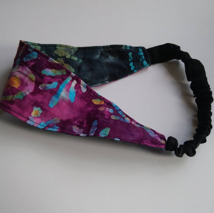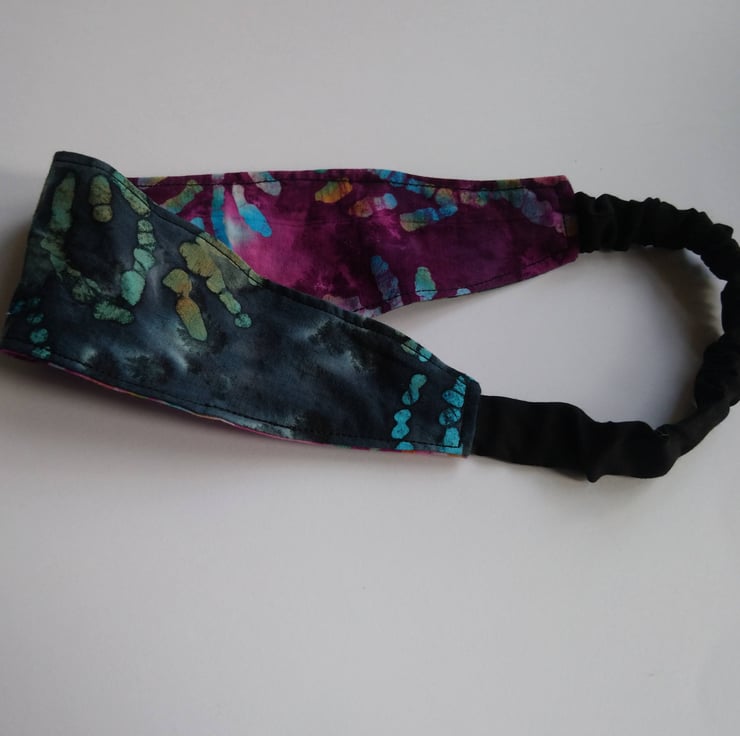 This is a reversible headband with an elasticated back for best fit. There are two different but coordinated cotton batik prints so that you can choose which suits your day!