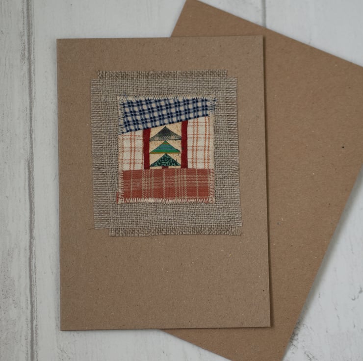 This one off textile card featured a teeny tiny patchwork tree stitched onto a hessian type textured border. It is blank inside.