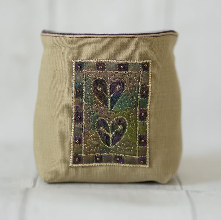 This one off piece features a pretty panel which I've made using felt, organza and metallic threads. The use of a soldering iron has created different colours and textures. Metallic gold beads and topstitching add a final touch.