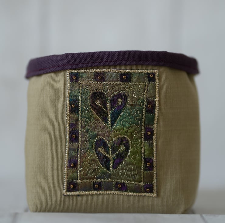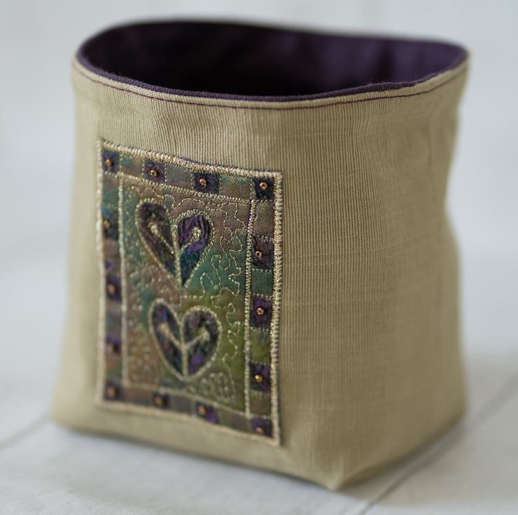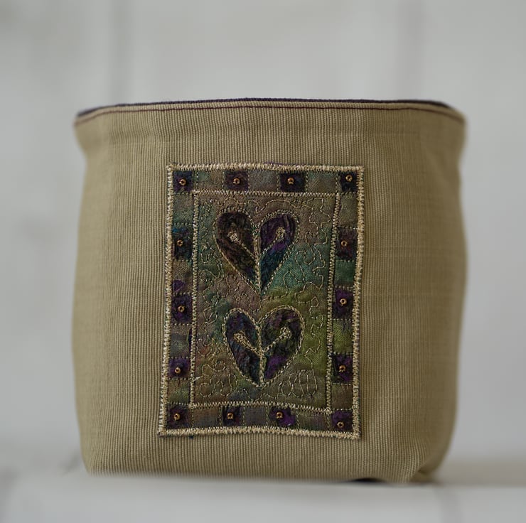 The outer fabric is a furnishing weight sage green. The aubergine coloured lining has a canvas texture.