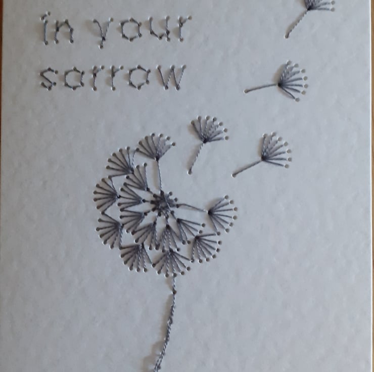 An elegant sympathy card featuring a dandelion hand embroidered in grey onto a white textured card with the wording Sharing in your sorrow.