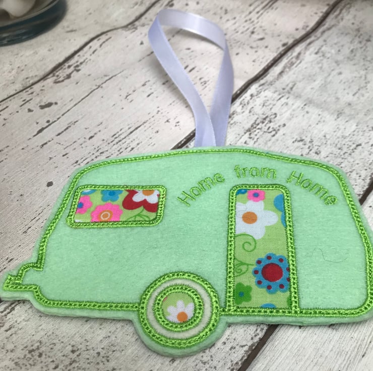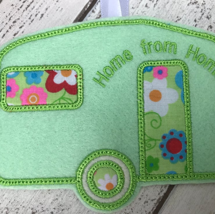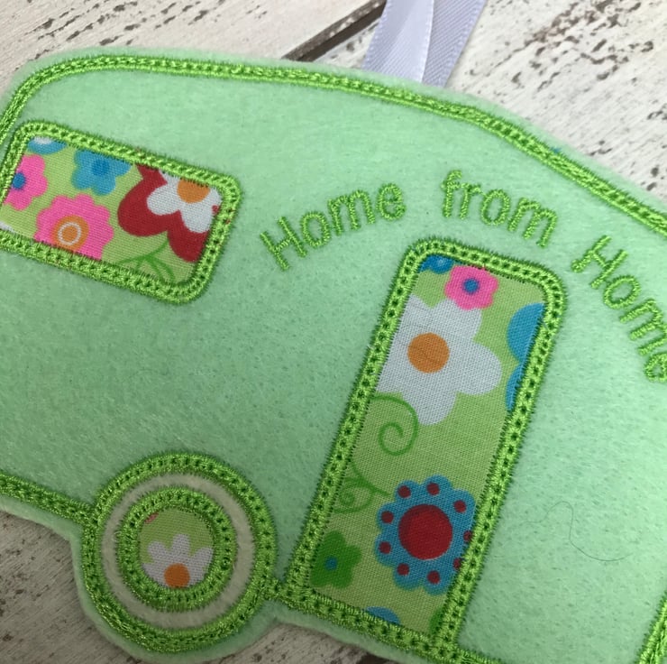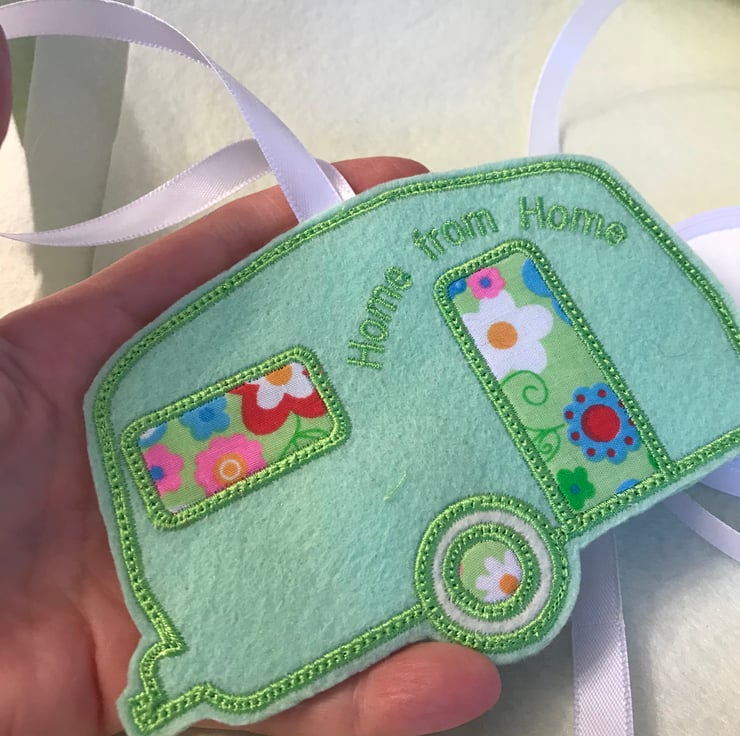 Really sweet and cute boho hippie caravan felt decoration designed by me. A perfect sending gift for anyone missing their caravan. Made with pastel green felt and retro look fabric. In a 80s design era of caravanning. With lime green words Home from Home.