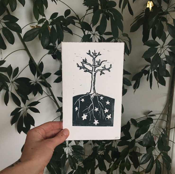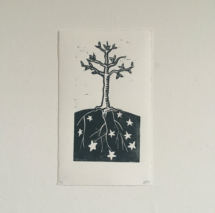 A medieval inspired linocut print of a tree with roots and stars, in a very dark shade of blue on handmade bamboo washi paper.