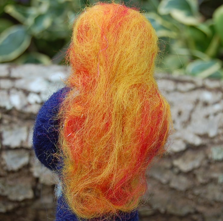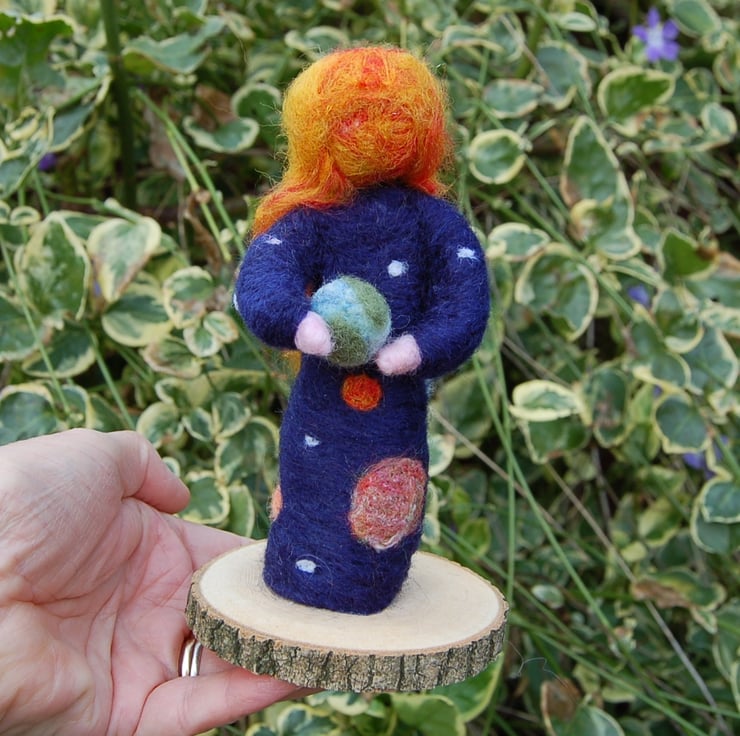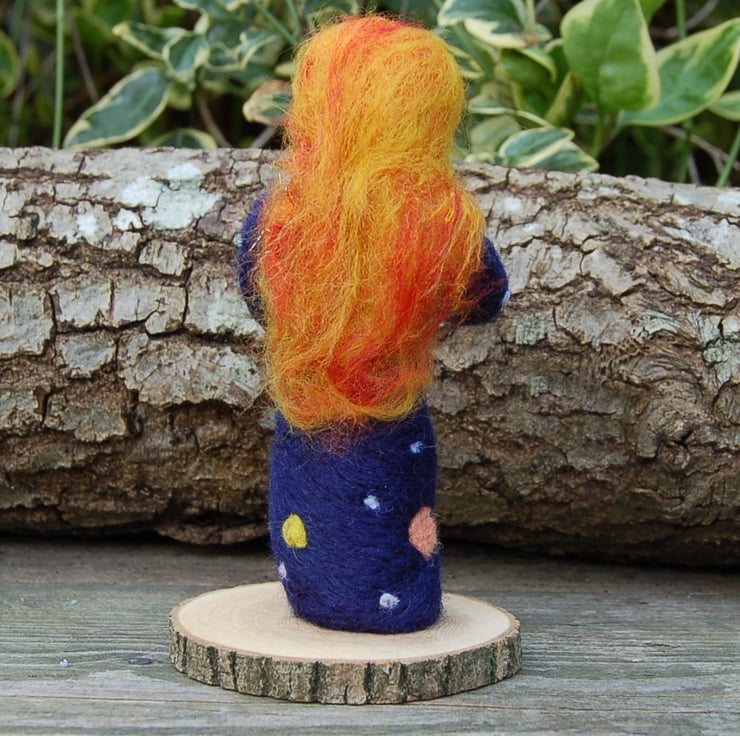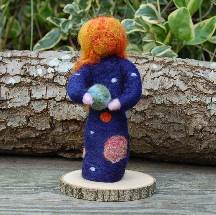 Made using unspun wool and jabbed with a needle into a figure shape. The planets have been needlefelted onto her dark blue dress and the sun is represented by her face and hair. She is holding a needlefelted Earth. The Earth is not attached - it is just resting on her hands.
