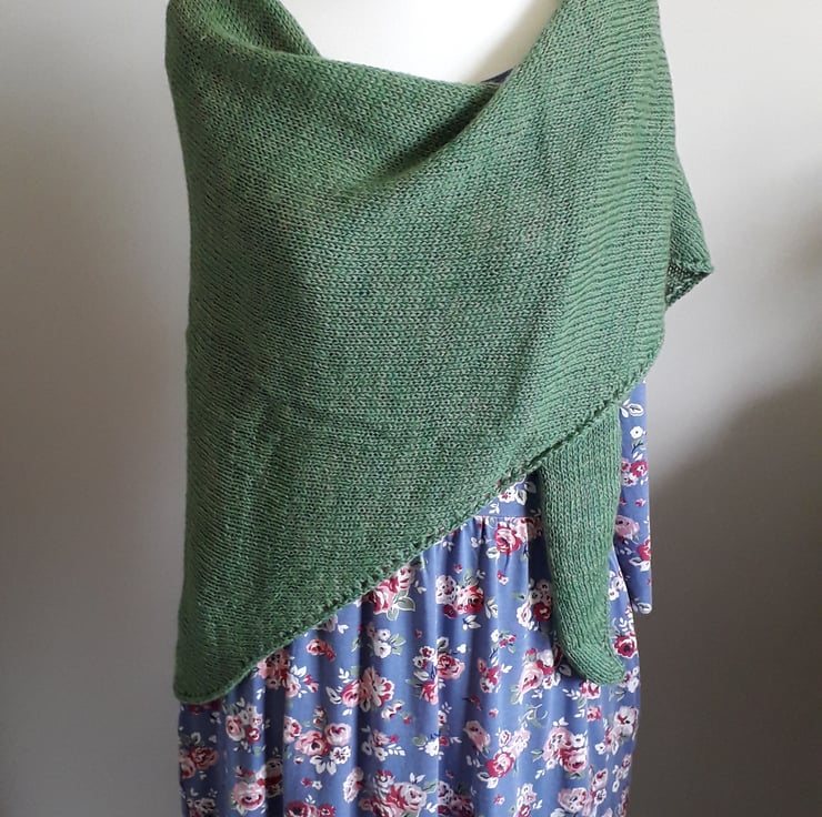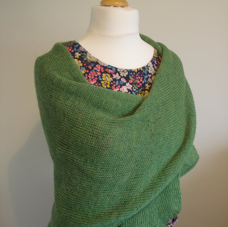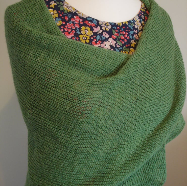 This triangular wrap has been knitted on a hand operated knitting machine using 100% British Wool. It features pretty eyelets along two sides for a decorative finish.