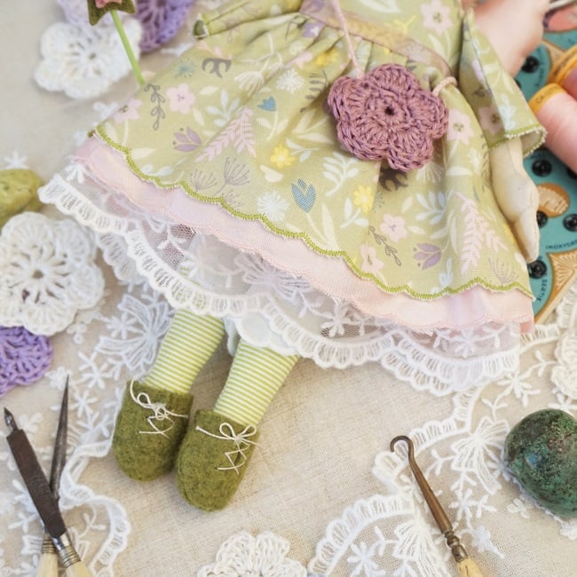 This is Posie. A new smaller pattern, she is about two thirds the size of my witch. This little Fairy God Mother has a ditsy print dress in a spring green with pink,lilac and white flowers dotted about, a silk petticoat in soft pink with lace slip and knickers. She has silk wings and sports a little felt wand. Her shoes are the smallest I have ever made and are felt. She has an rose quartz to her heart with lavender in her stuffing and is finished with tiny buttons, organza ribbon and a little coronet in her hair. Just loved making her xx