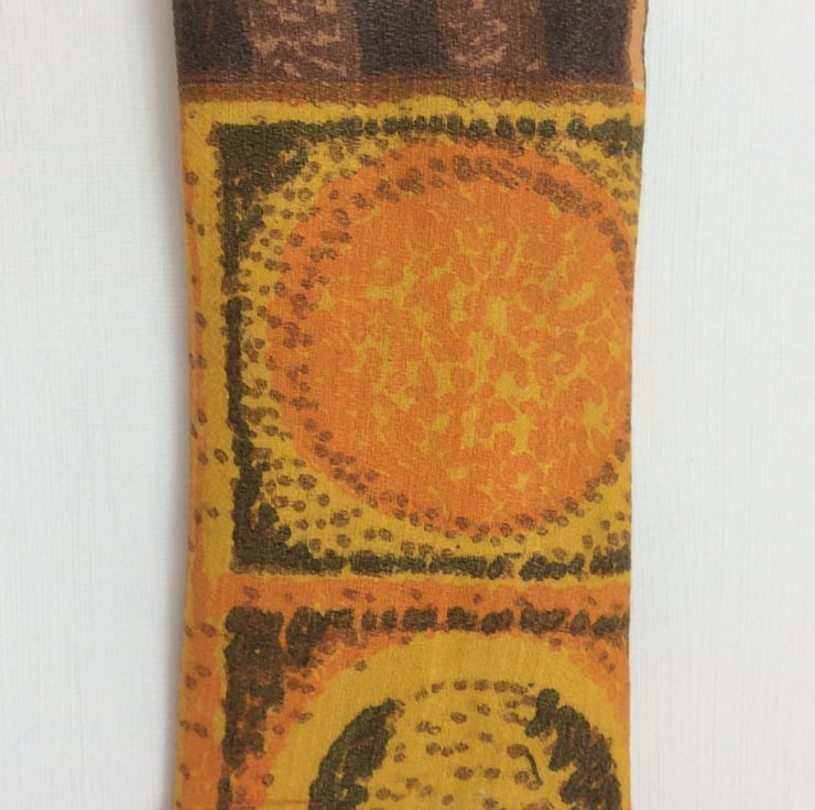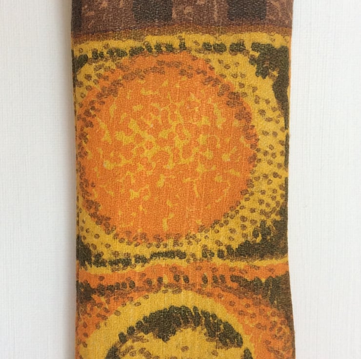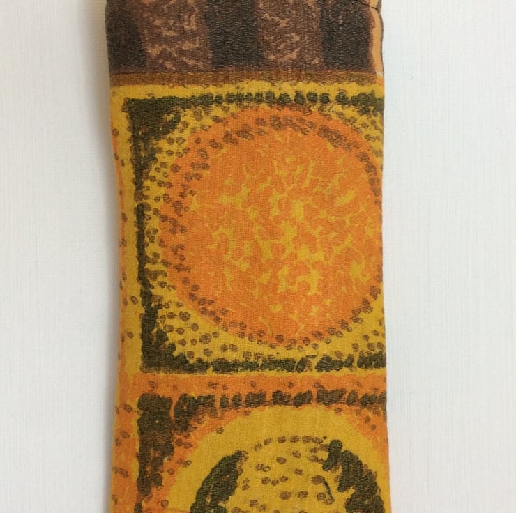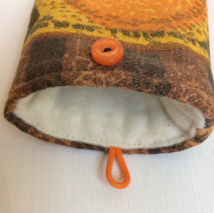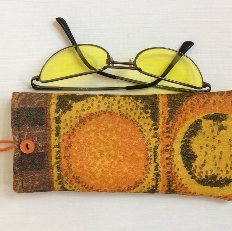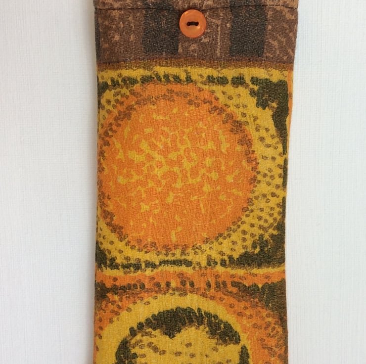 This stylish glasses case is made from a sixties style vintage fabric in shades of orange, brown and beige. It has a small orange button and orange cord loop closure. It is lined with a soft, fluffy off white fabric and interlined with felt. The case measures approximately 17cm x 8cm.