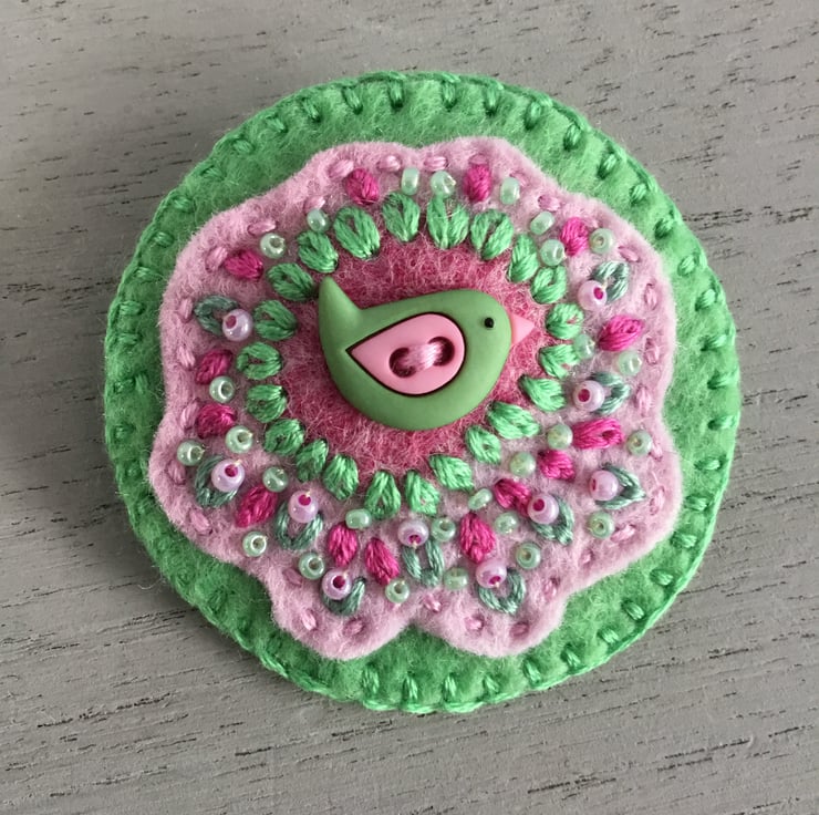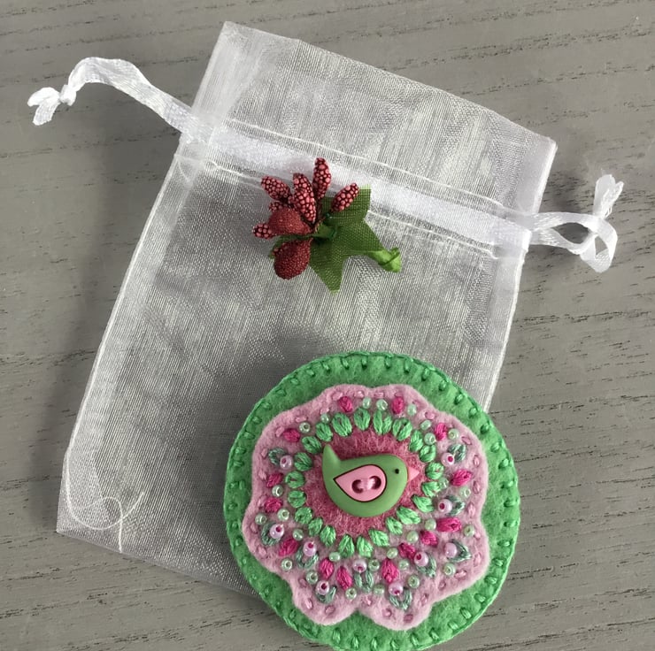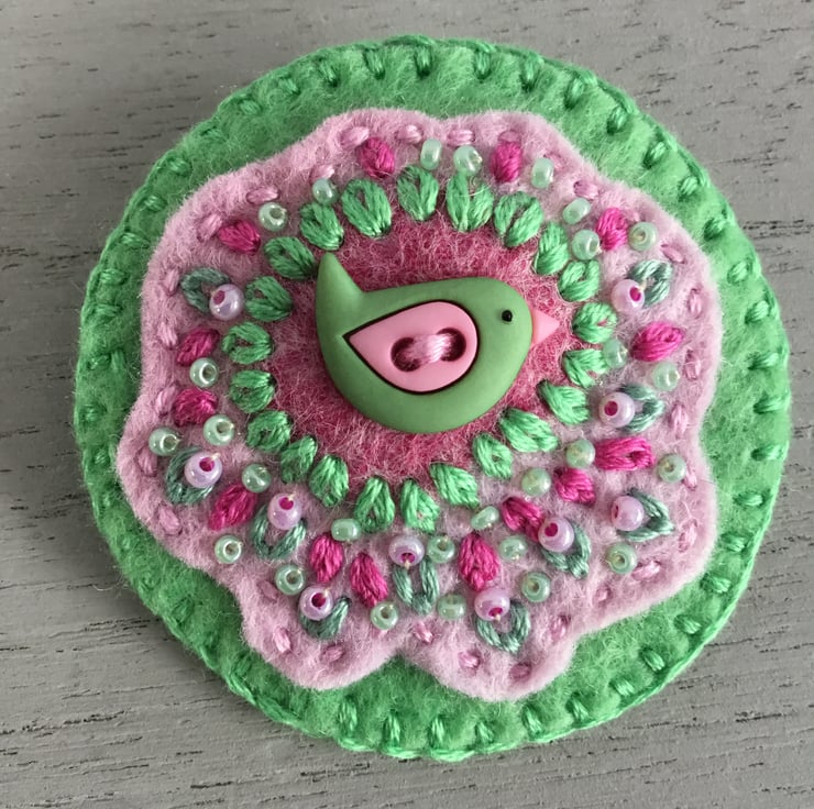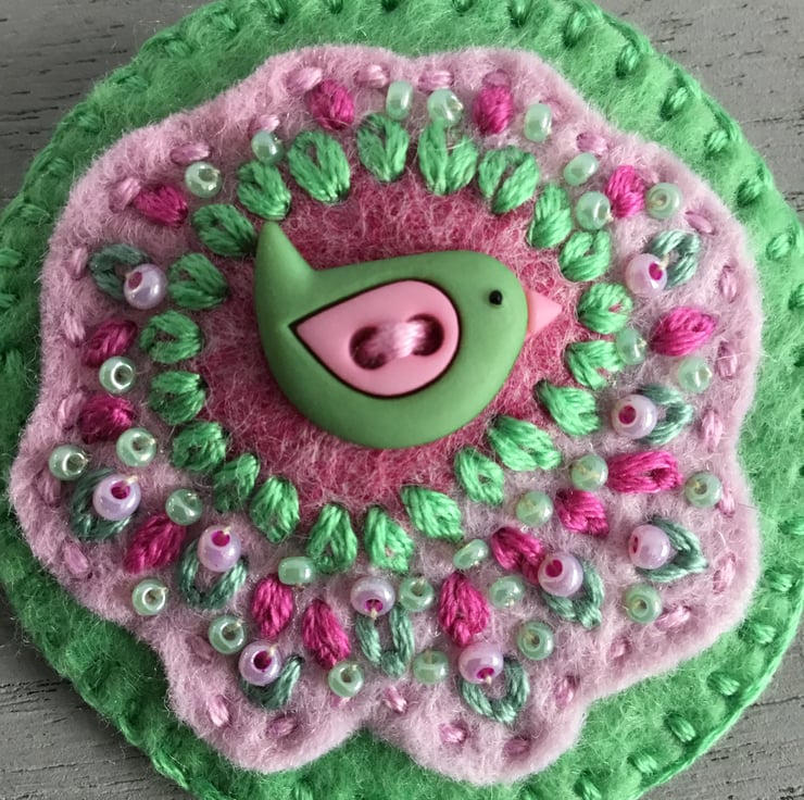 This Hand Embroidered Blossom Bird Brooch is in pretty blossom colours of pinks and greens. A small bird button is stitched onto circles of rose pink and green felt, edged with green Blanket Stitches. Lazy-Daisy Stitches in pink and green embroidery threads with pale pink and green seed beads are hand embroidered around this happy bird.