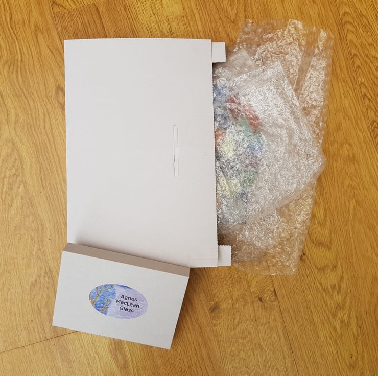 The stained glass Celtic inspired butterfly is made using the copper foil technique. which involves cutting the glass shapes, smoothing the edges using a grinder, encasing each piece in copper foil and then soldering them together.