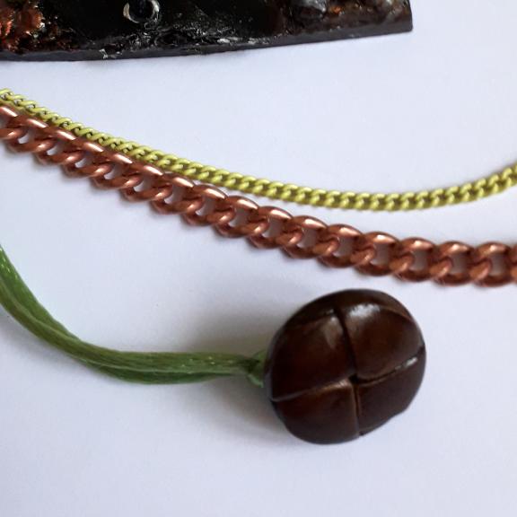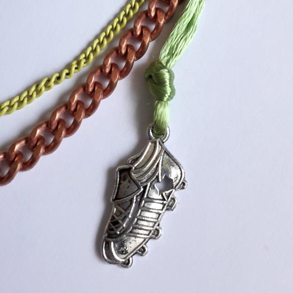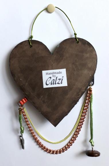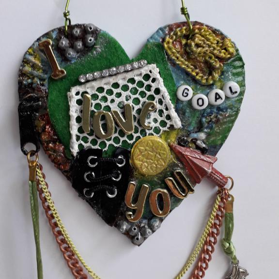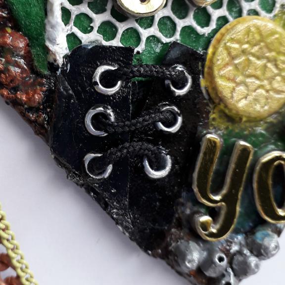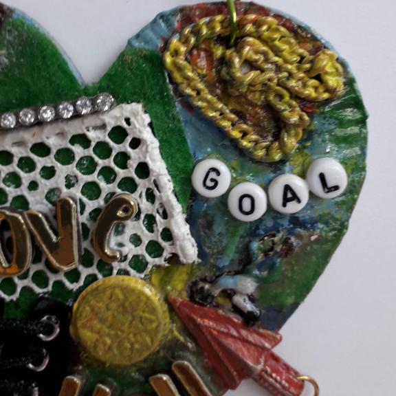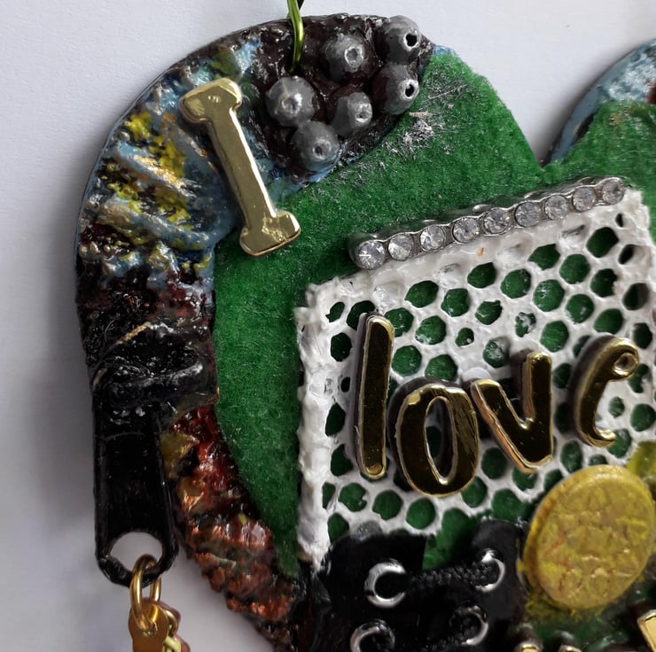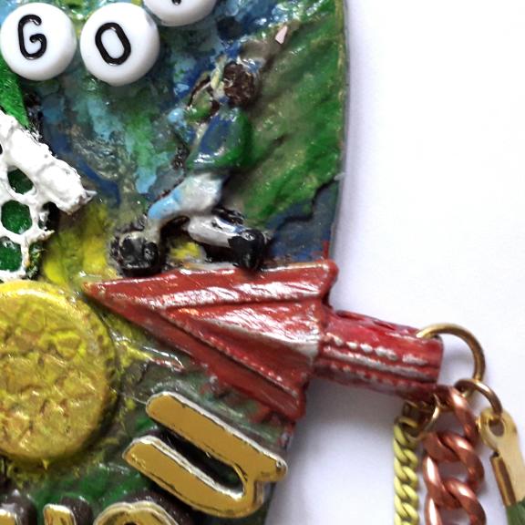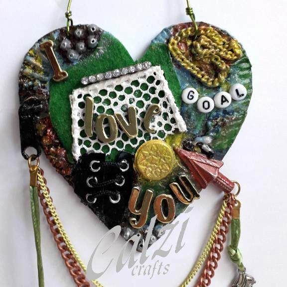 For this football themed 10cm heart I have used papers, texture paste, clay, felt, letter beads, eyelets, an upcycled zipper pull, a scrap of netting, and bits of broken jewellery, I have also added a football player charm. There are 2 chains, one copper and a finer yellow one, on the right side there is a football boot charm, on the left is a vintage leather button.