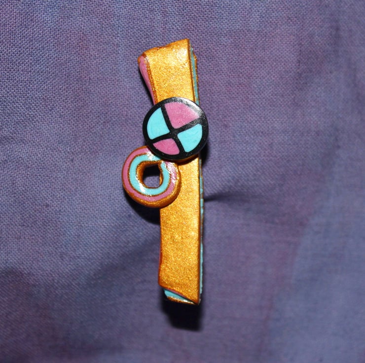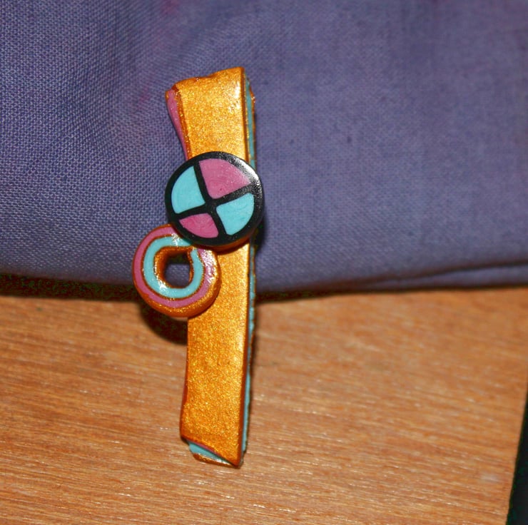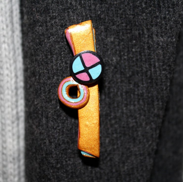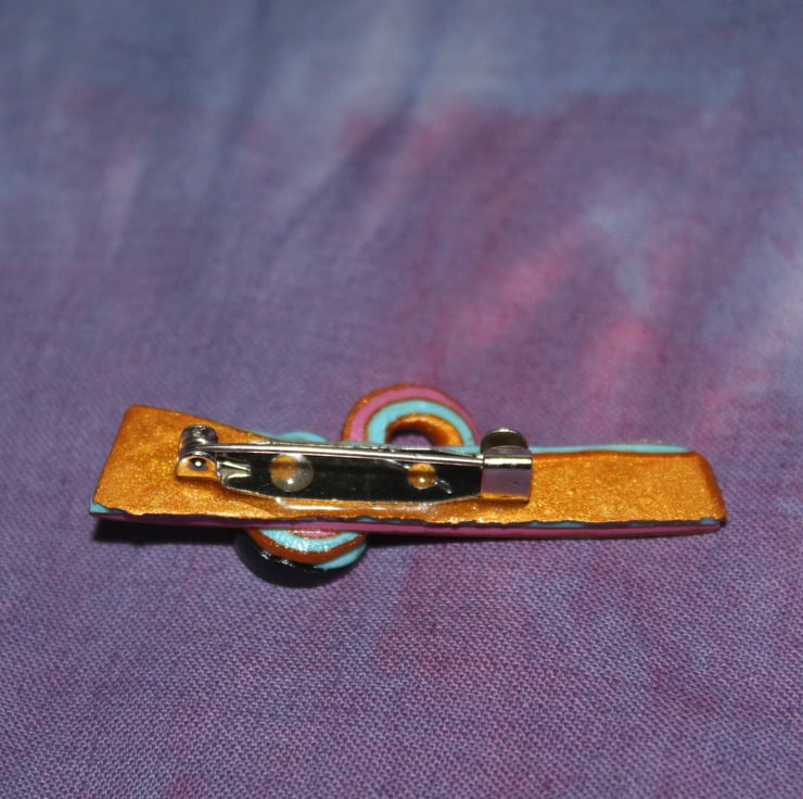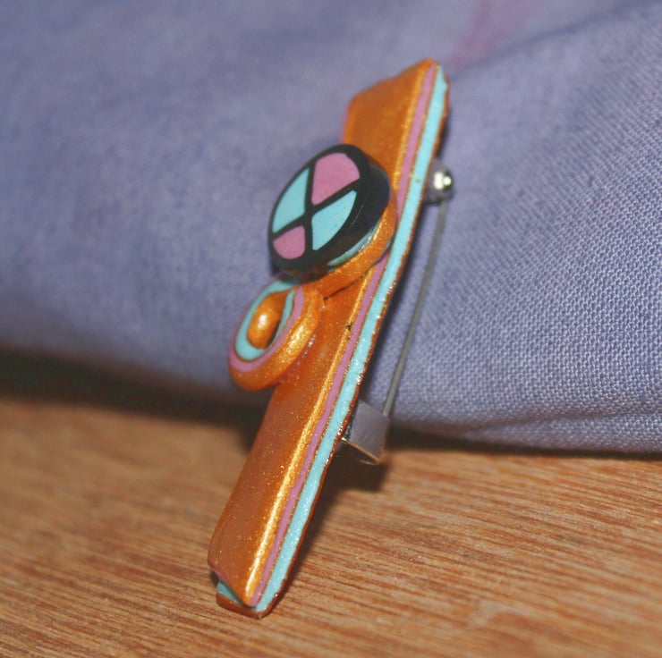 It is a unique, one-off design - fashioned by myself from polymer clay. This gives a very reliable pin-badge style brooch, the colors and patternwork will last forever. It is lightweight and has been polished to a fine degree.