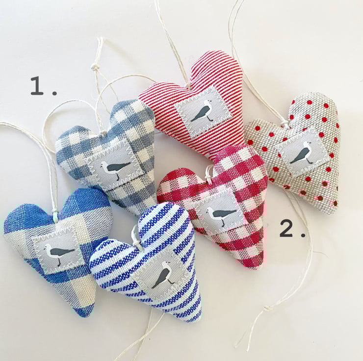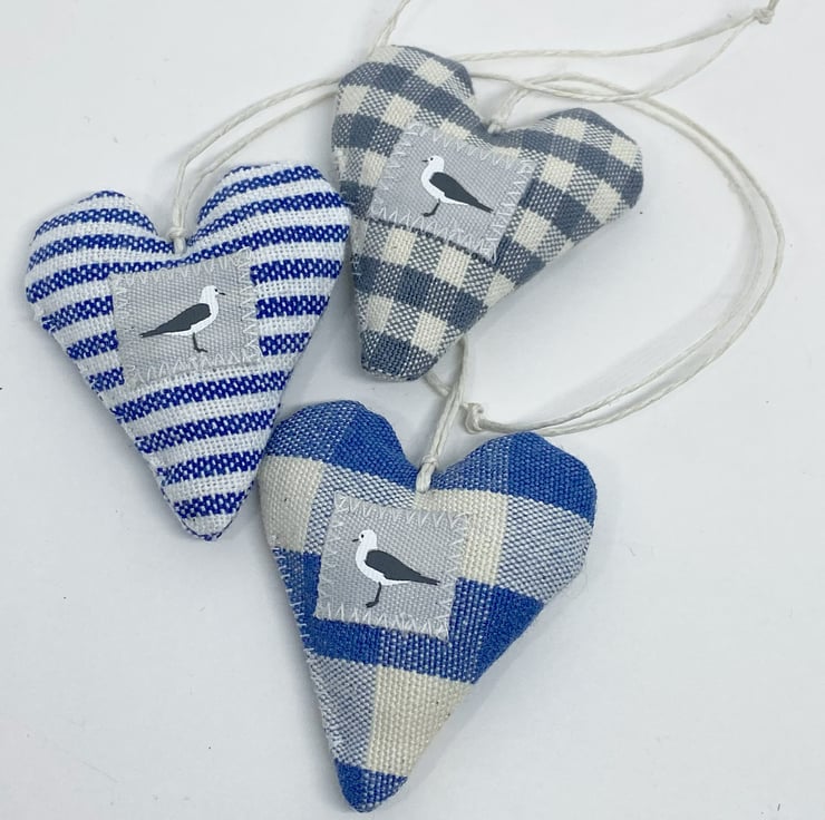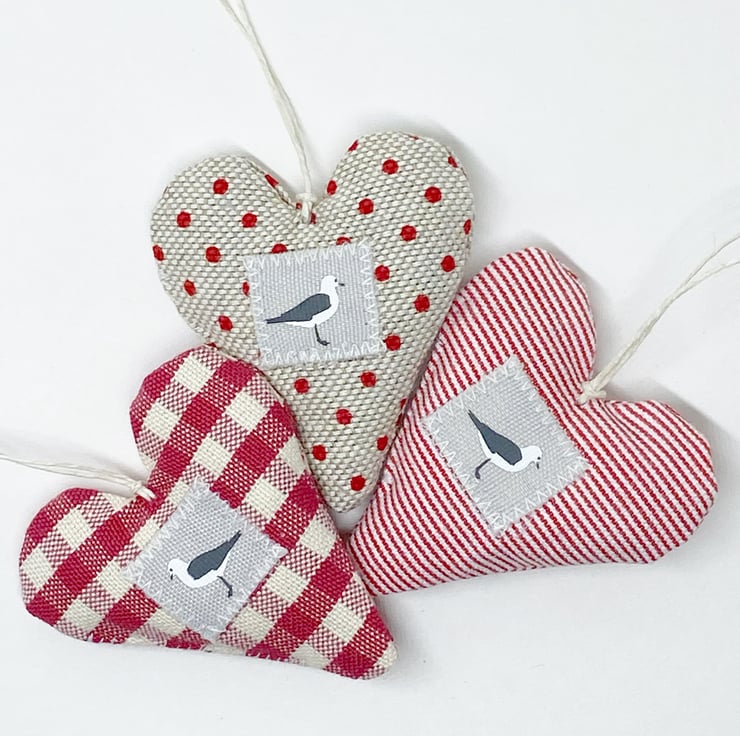 A very cute trio of dinky hearts featuring a little seagull motif on the front and a linen 'h&h' label on the back.