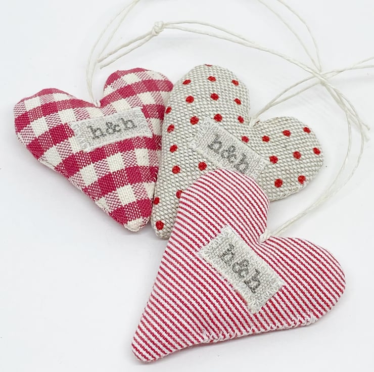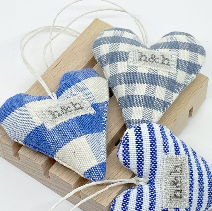 Handmade in my Hampshire garden studio, the three hearts are filled with locally grown wonderfully fragrant lavender and have a natural hemp twine hanging loop.