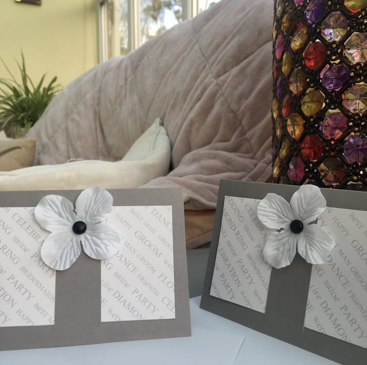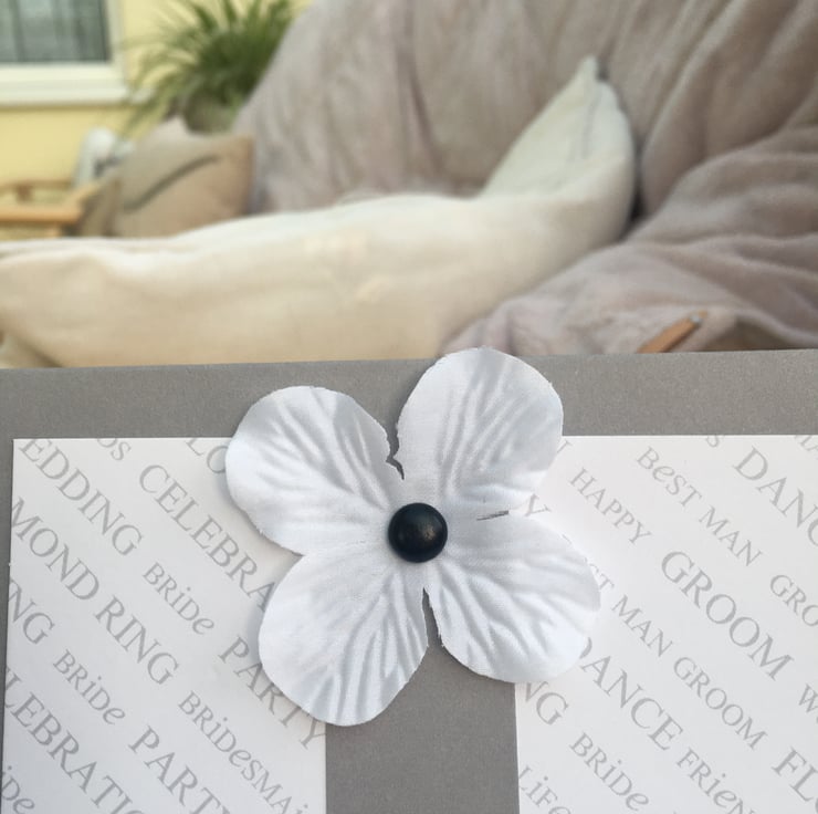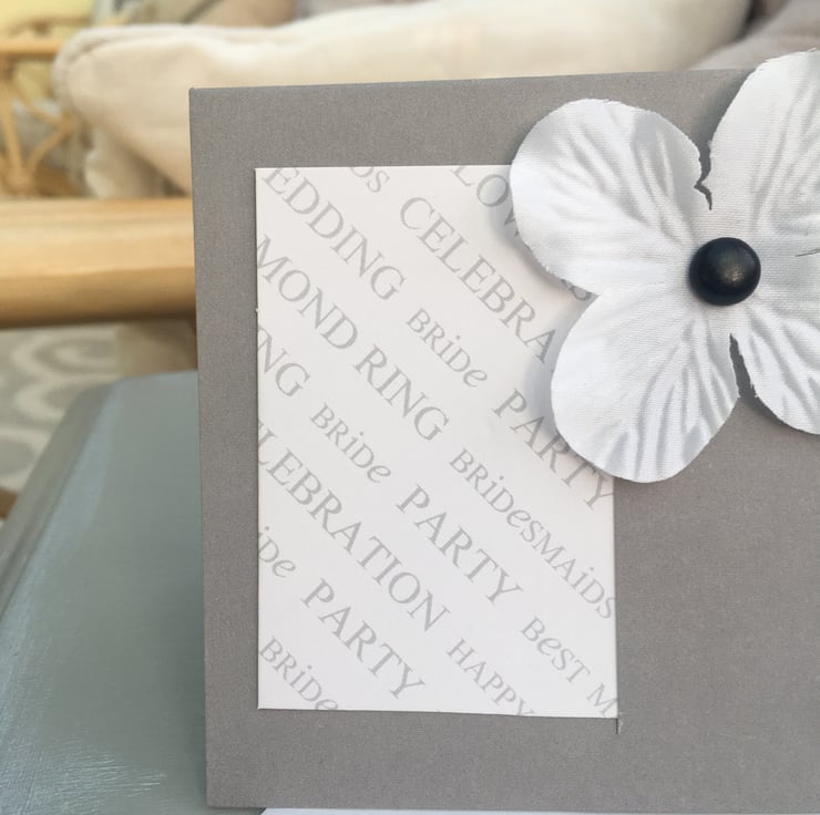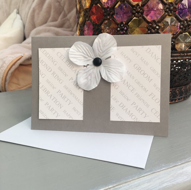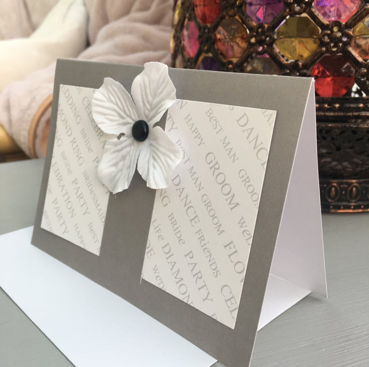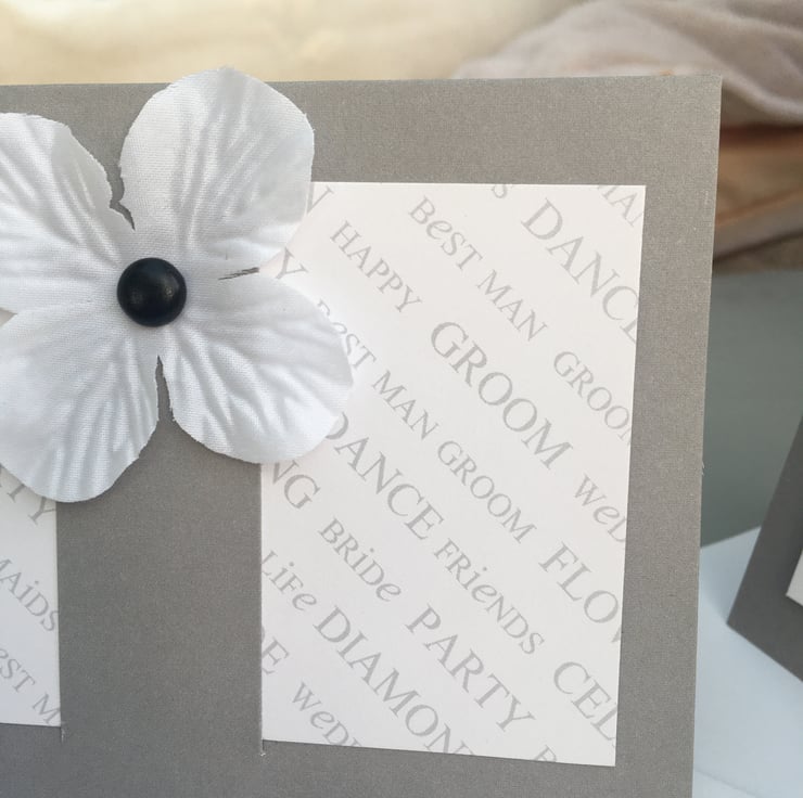 A simple and classic caed to hold a gift card. Sometimes the happy couple want to choose their own gift so a gift card is the perfect solution. This 13x9.5cm gift card holder is predominantly grey, a very classic colour. 2 slots allow a white word printed peice of paper to adorn the front. A white fabric flower is attached by a black brd, this keeps the paper in place. The inside of the card has slots for the gift card.