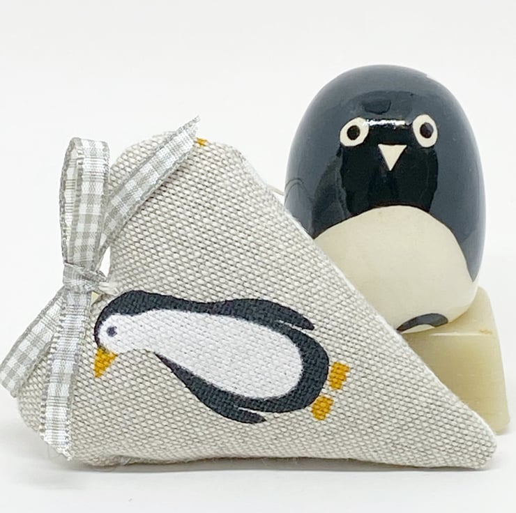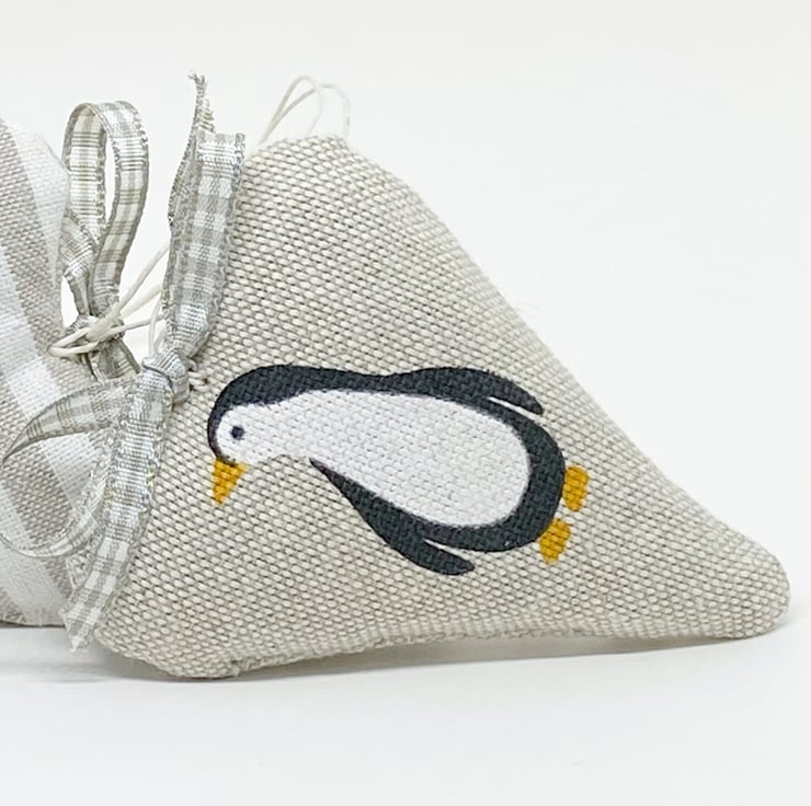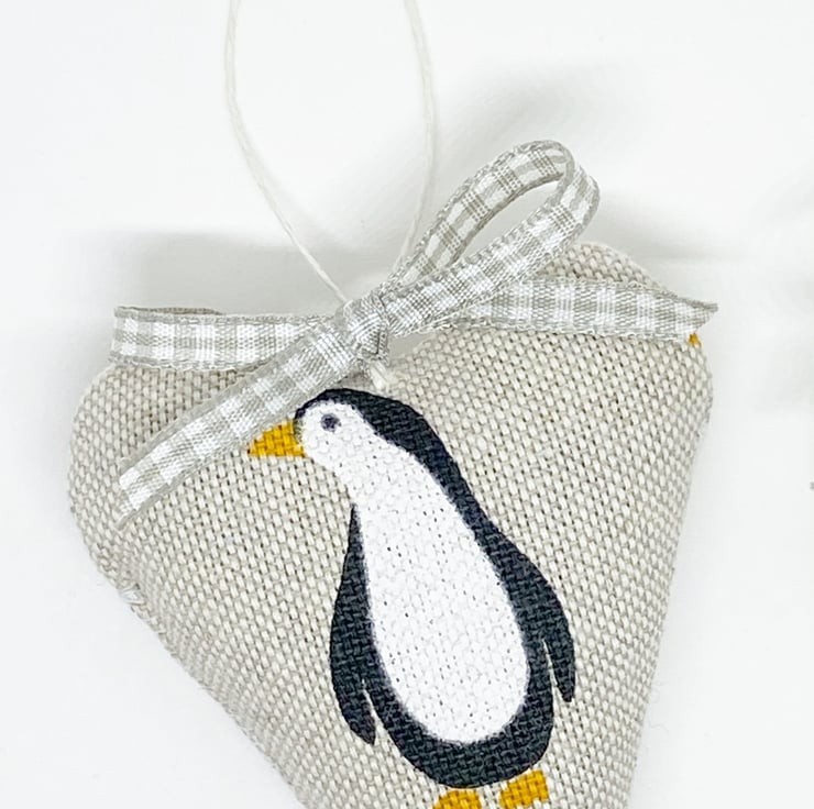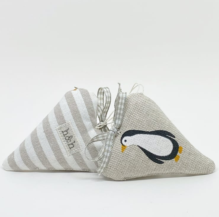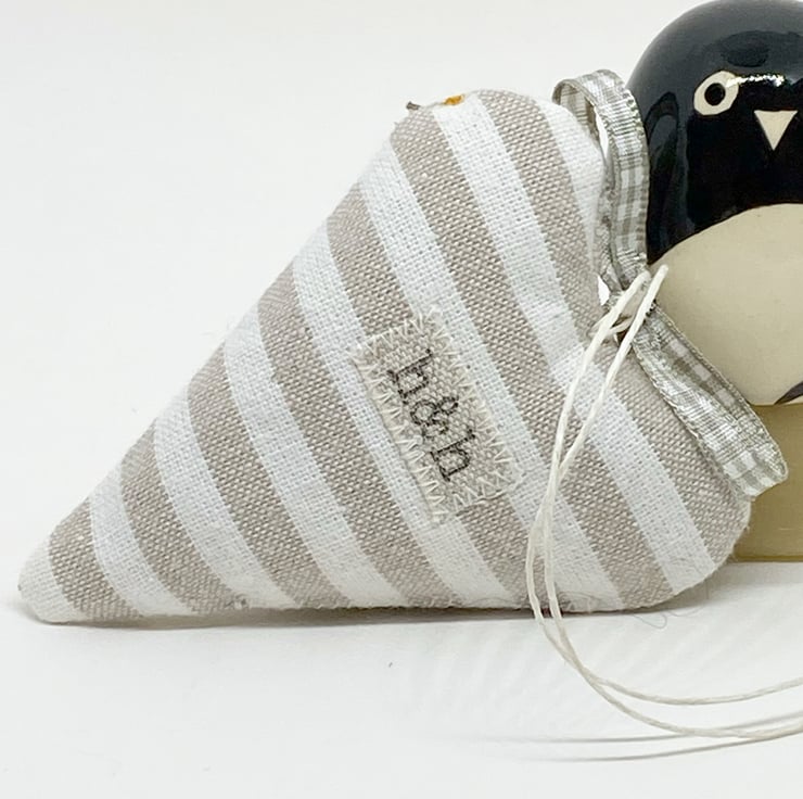 These appealing hearts feature a lovable printed penguin on a taupe background on the front and taupe stripes on the back. Generously stuffed with fragrant lavender and finished with a taupe gingham ribbon bow and a natural hemp twine hanging loop.