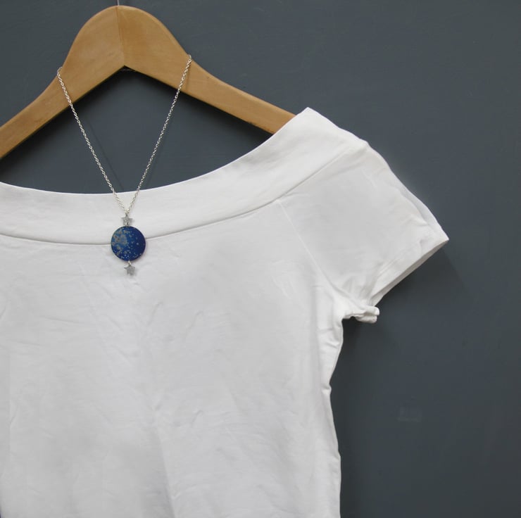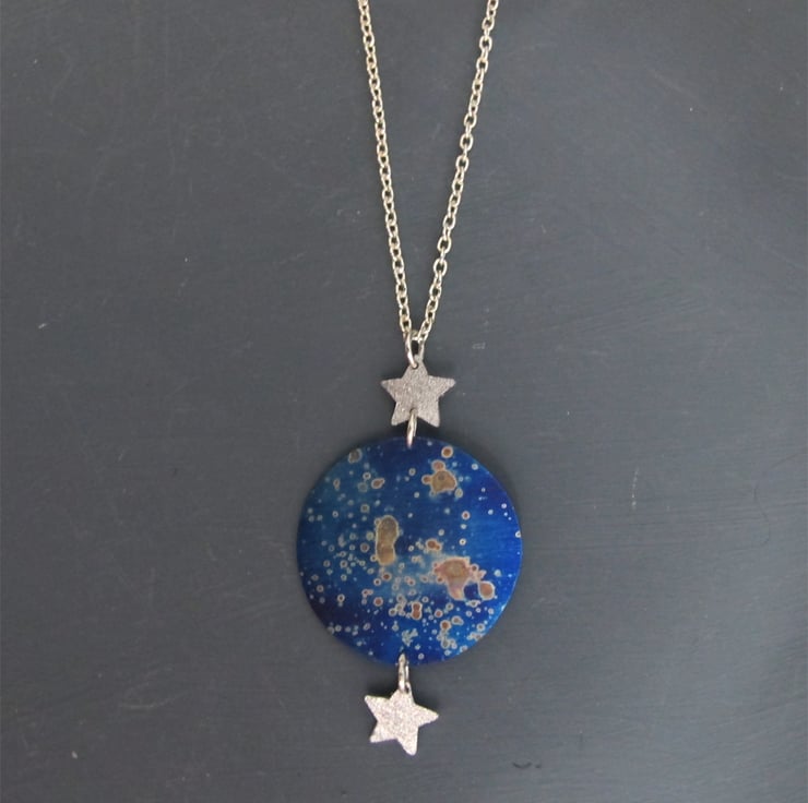 Aluminium and titanium pendant that captures a miniature galaxy ready for you to wear. The titanium disc has been treated and anodised to create a mini nebula/galaxy with swirls of blue, purple and light blue with far off stars. The pattern is completely unique and individual.