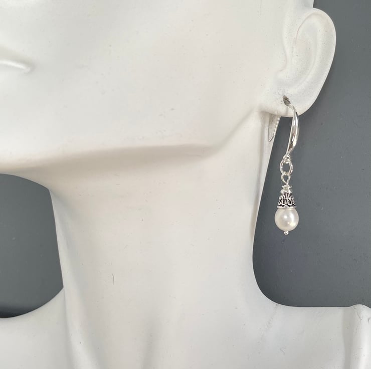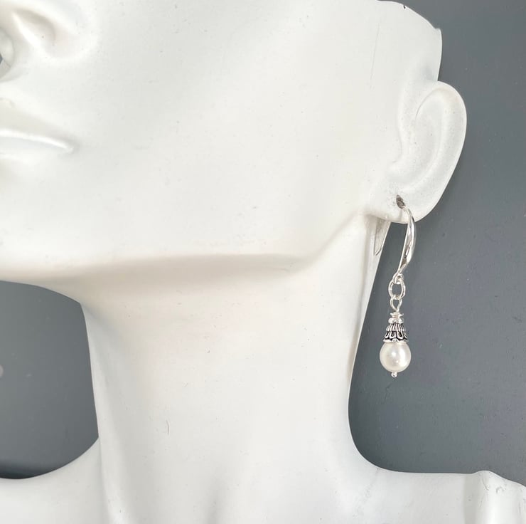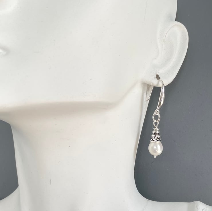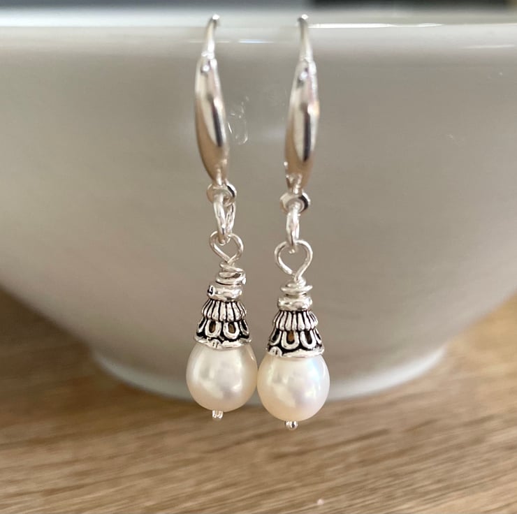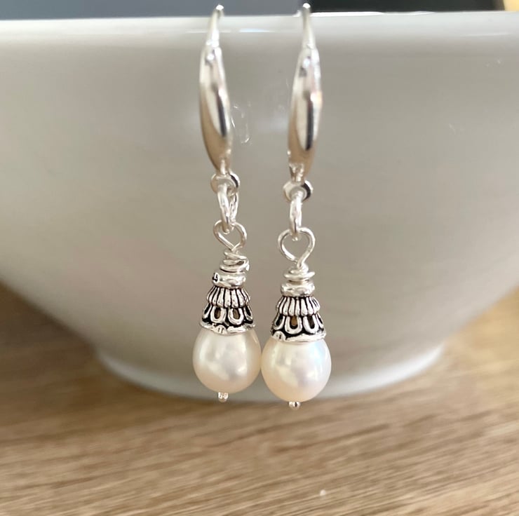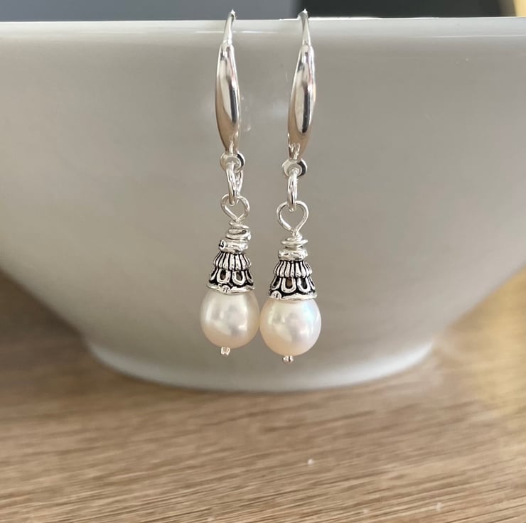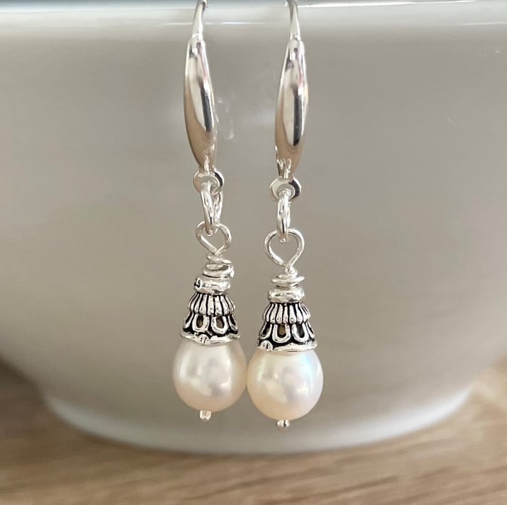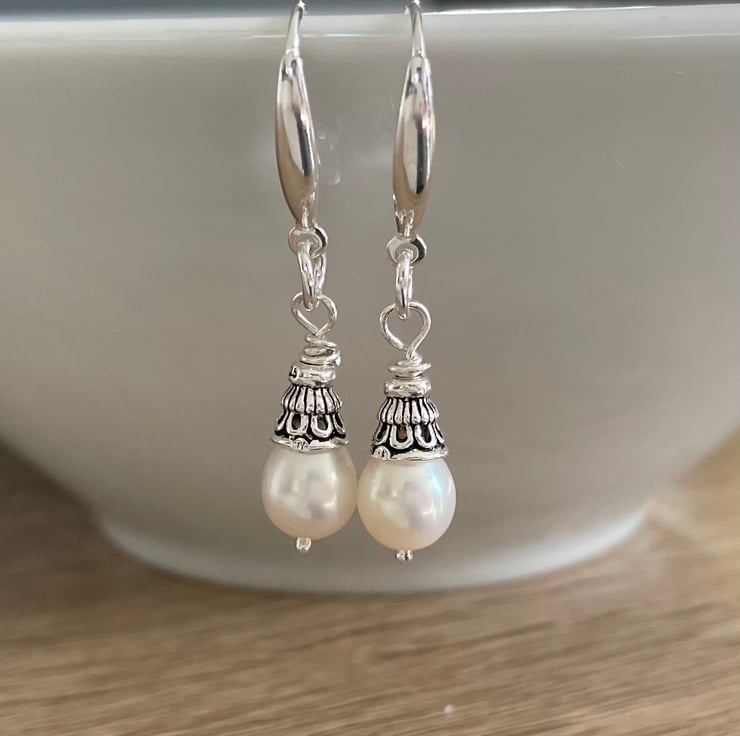 White Pearl Sterling Silver Earrings - Made with beautiful teardrop shaped white Freshwater Pearls, wire wrapped with Sterling Silver wire. I added the Sterling Silver beadcap, the earrings hang from Sterling Silver earring hooks.