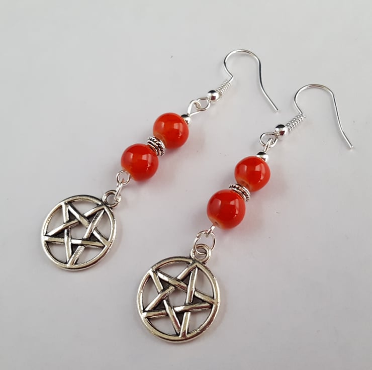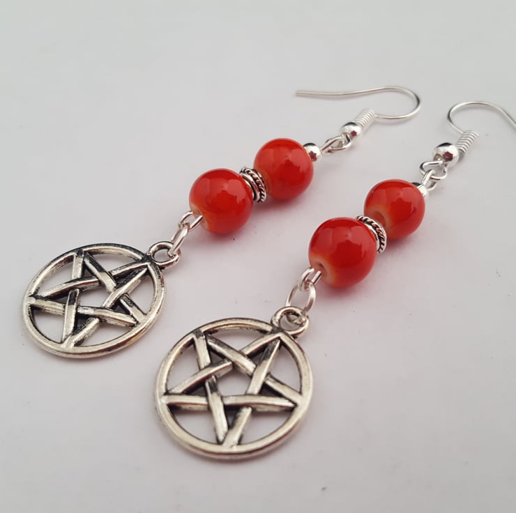 8mm red marbled glass beads and 15mm Tibetan silver pentagrams on silver plated hypo allergenic hooks.