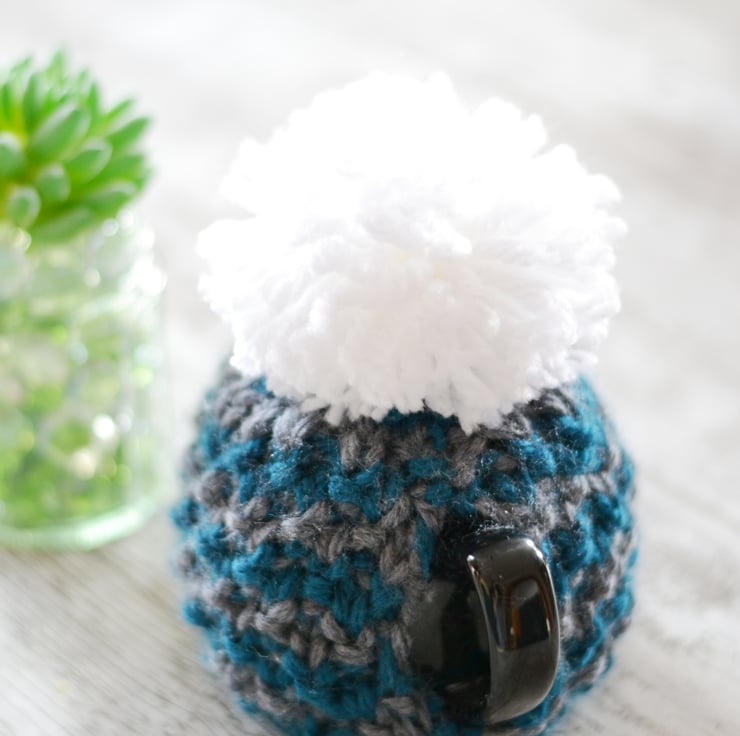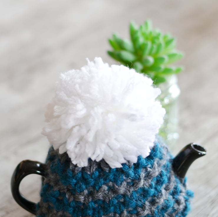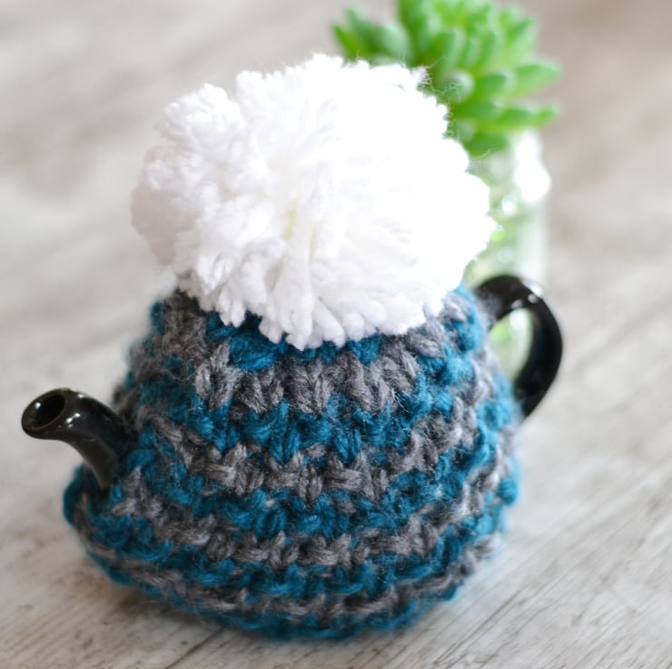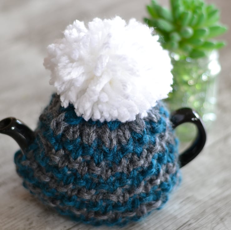 New design for this winter a super chunky knit tea cosie which is one of my own patterns. A lovely Petrol and Dark grey stripey patterned cozy.