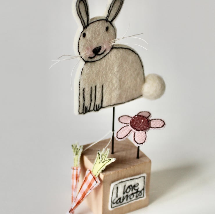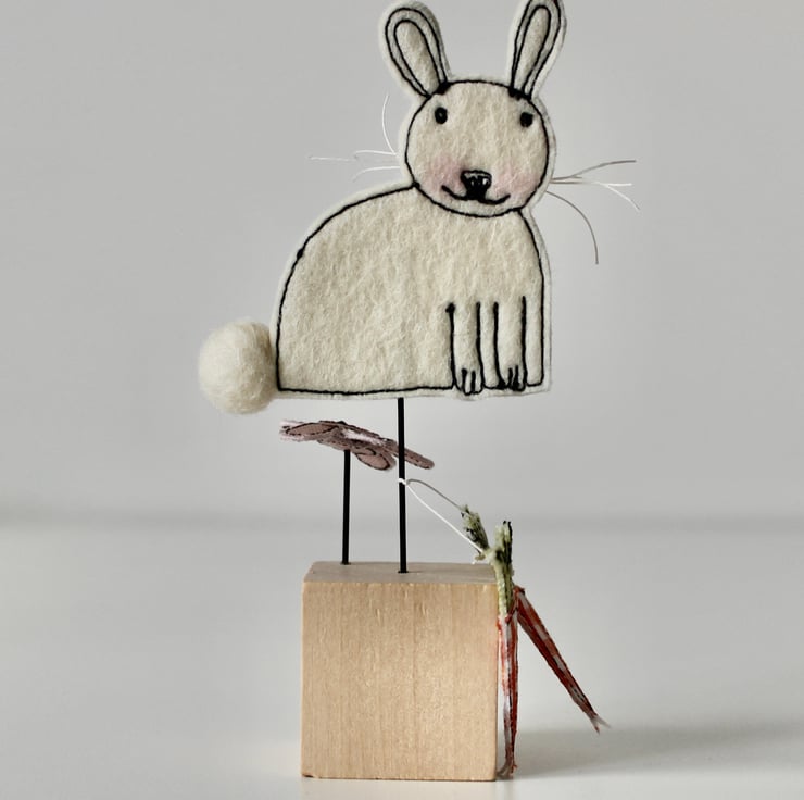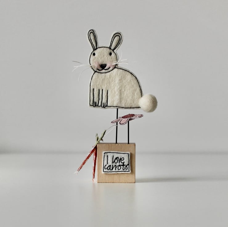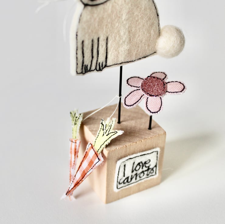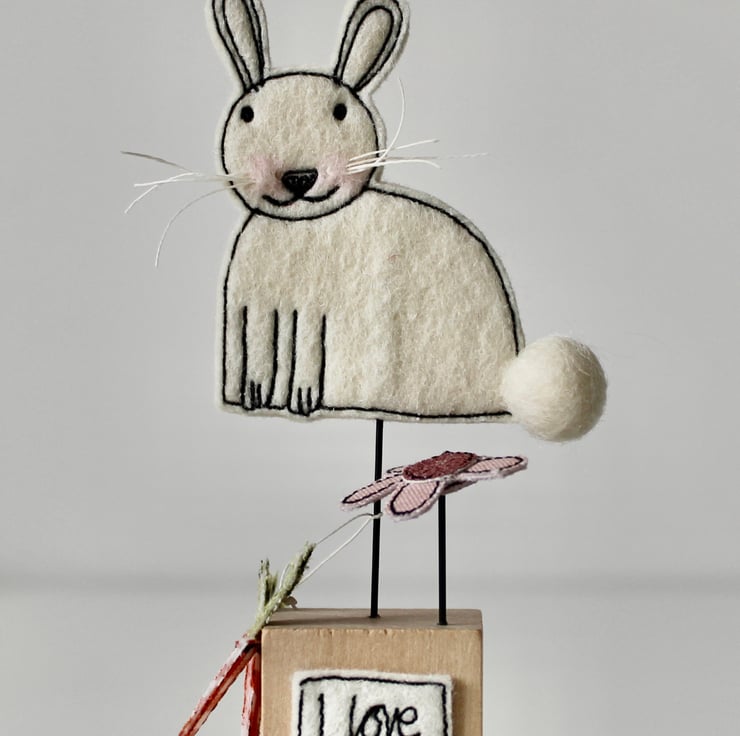 Little Bunny is created using 100% wool felt, glitter cloth, cotton cloth, free hand machine embroidery and is cut out by hand using very sharp scissors. He is mounted on a 3cm cube wooden block, which can adorn a mantle piece or any flat surface.