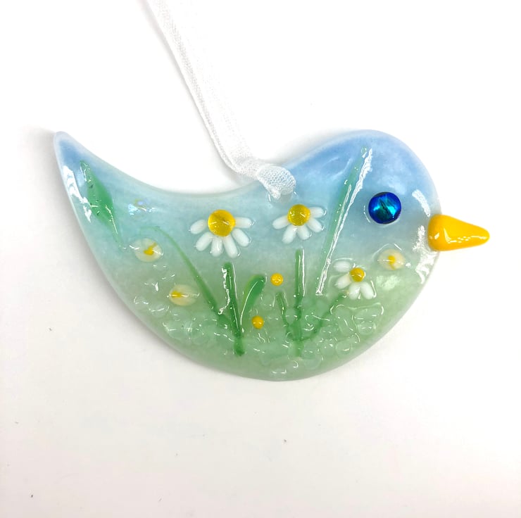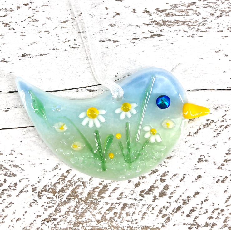 This gorgeous little bird is a mini work of art and no two are the same. It has had two firings in the kiln and the detail is made up from tiny pieces of lamp worked glass with sparkly elements of dichroic glass.