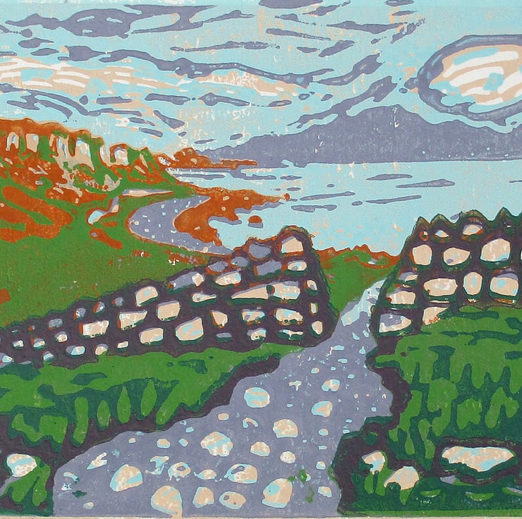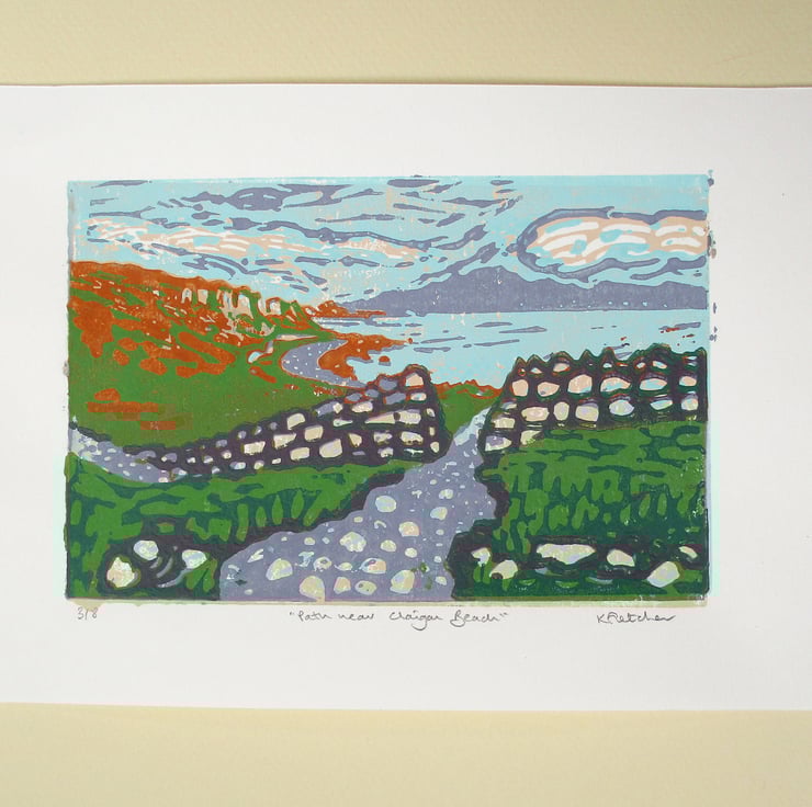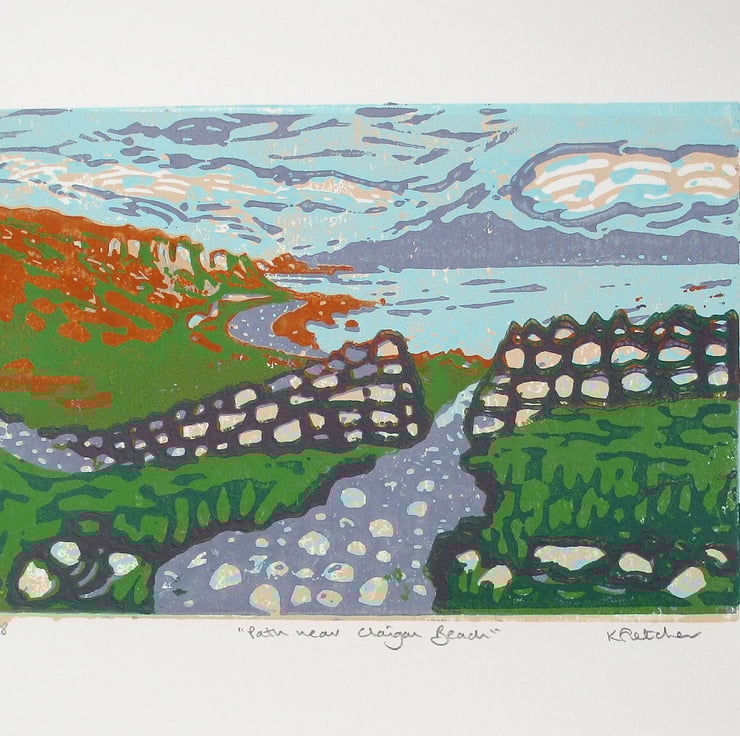 This is an original hand pressed limited edition linocut print of the coast path to Claigan Beach near to the village of Dunvegan on the Isle of Skye, Scotland.