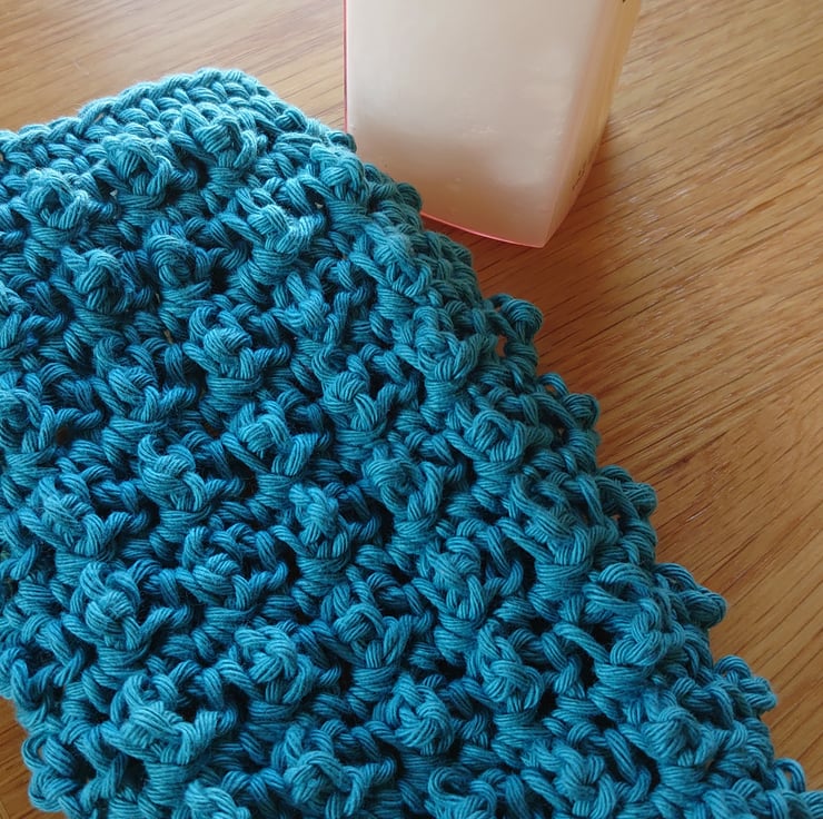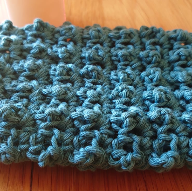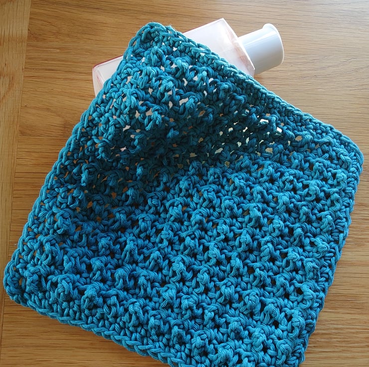 Beautiful flannel in turquoise; crocheted in 100% cotton yarn, lovely 'bobble' pattern; makes an ideal gift particularly if partnered with soap or bubble bath or add to a spa set.