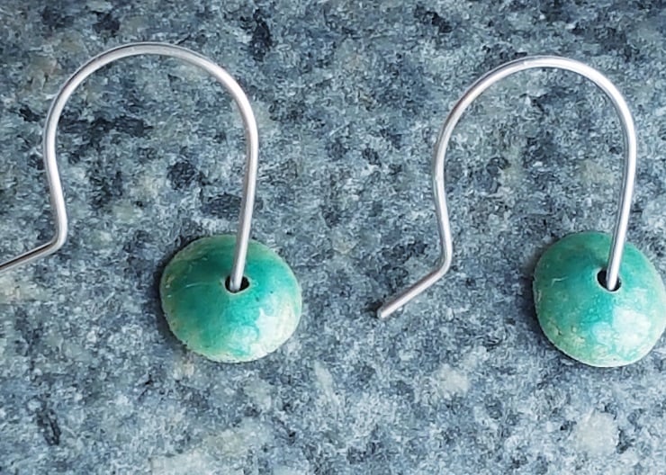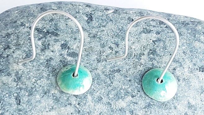 These lovely and light earrings were hand cut, filed, dusted with a single layer of transparent turquoise enamel then polished.