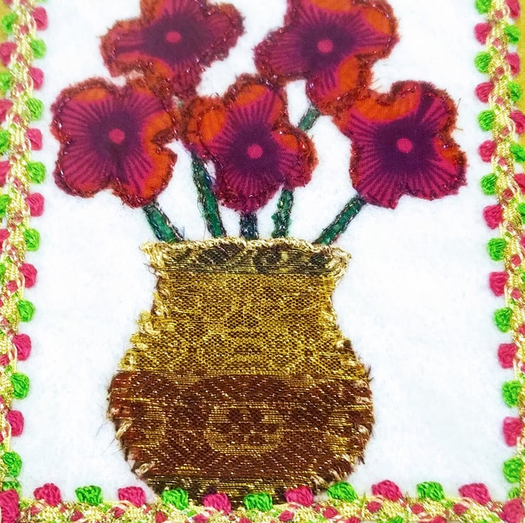 Hand embroidered with fabric on white felt background and framed with cord ribbon.