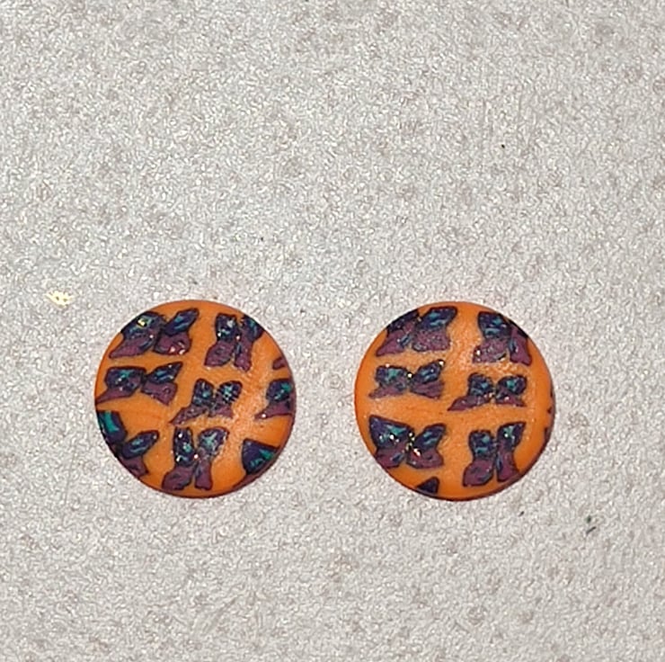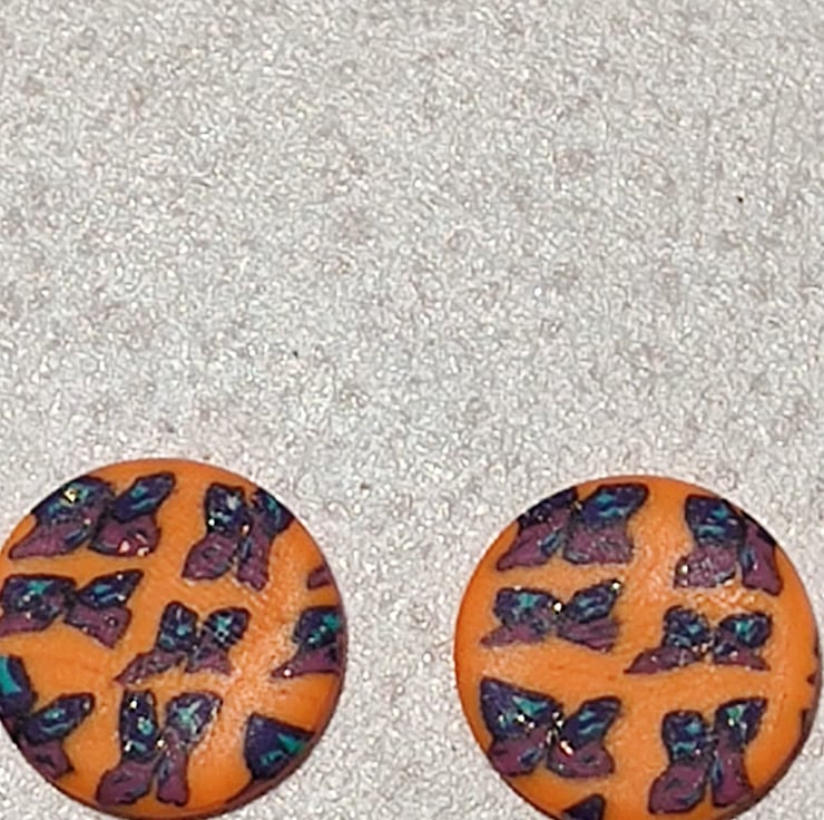 Hand made polymer clay earrings with a purple and blue butterfly pattern on an orange background. Stud fixing which can be painted with hypoallergenic coating on request for free. Please see all photos for close up detail. All products handmade therefore there may be minor imperfections. Each pair sold as seen, message for more