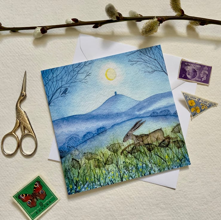 This card has been printed from an original painting that I did, featuring a hare running through a carpet of snowdrops with Glastonbury Tor in the distance. It is a blank greetings card making it suitable for a variety of occasions. It measures 14.5x14.5 cm and comes with an envelope.