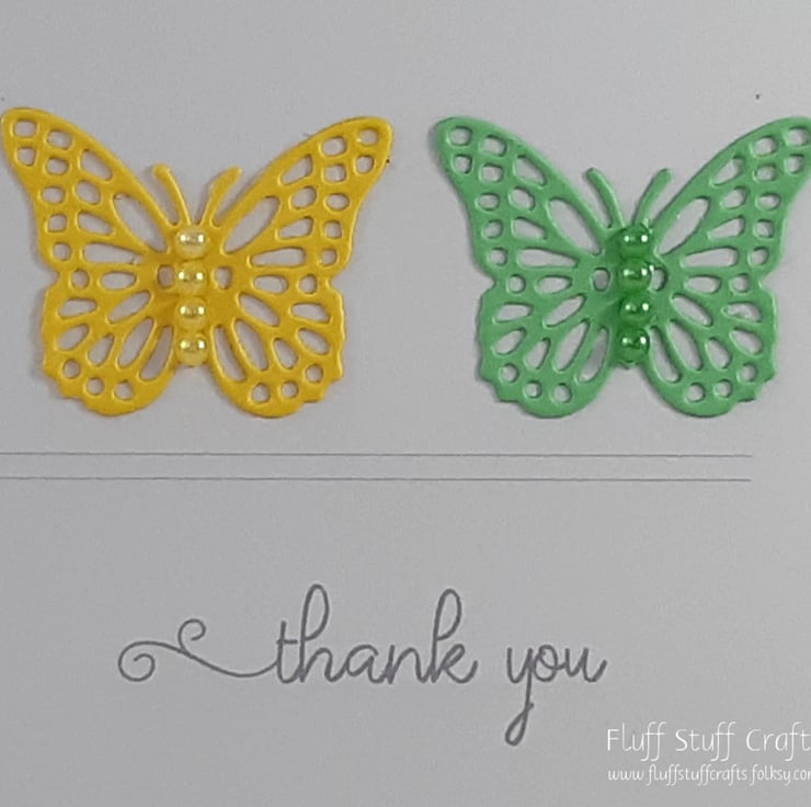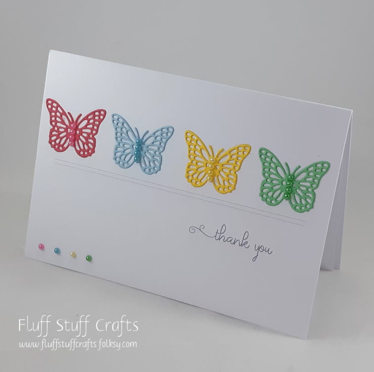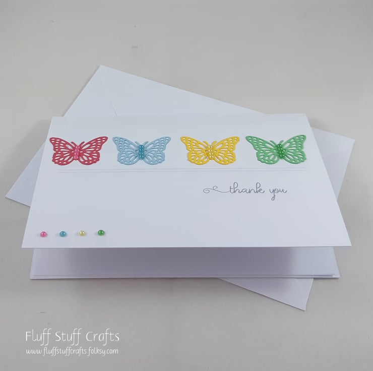 A6 thank you card featuring 4 die cut butterflies in pink, blue, yellow and green card. Each has 4 small adhesive gems for a body. Below the butterflies are two grey lines and the printed sentiment 'thank you'. The card is finished with a further 4 small gems, one in each colour.