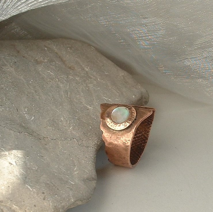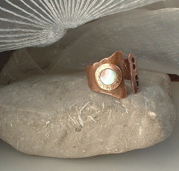 I love these rings because each one I make turns out differently making every one unique. Crafted from repurposed copper plate which has been cut to shape, filed and hammered to add texture and crenulations then annealed and shaped. A textured copper washer soldered in place holds a circle of mother of pearl which has a very pale blue/pink hue when the light catches it. Four holes are punched through to add another design element.