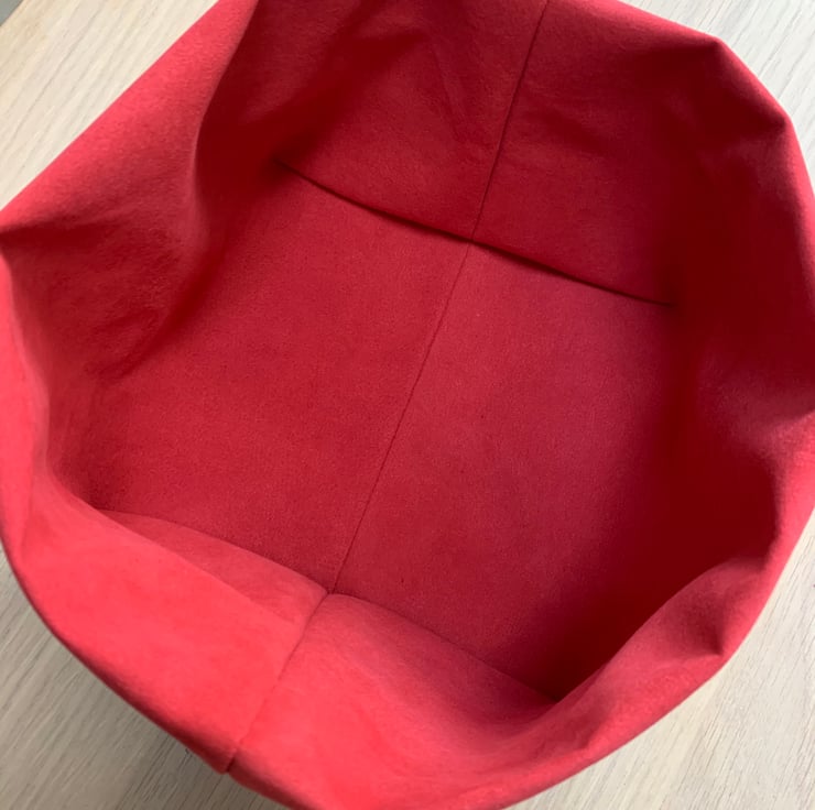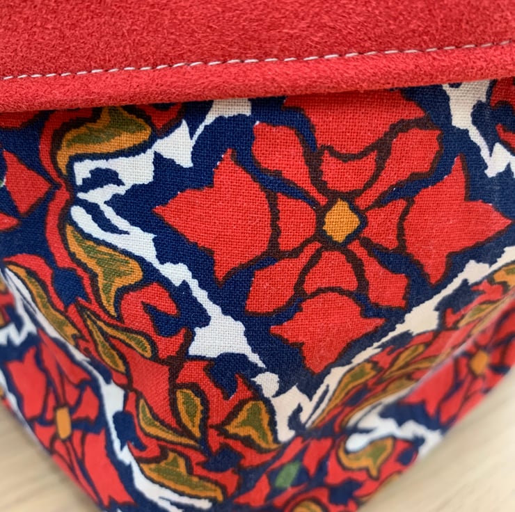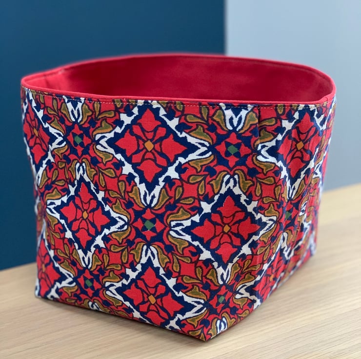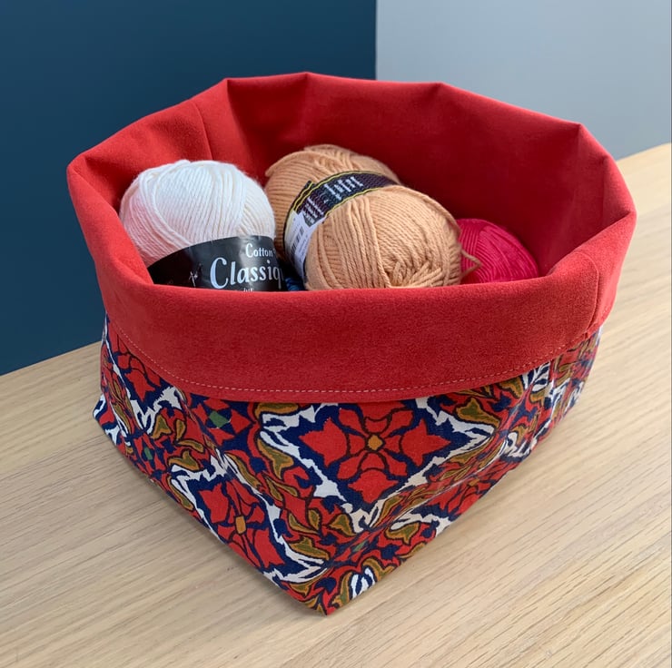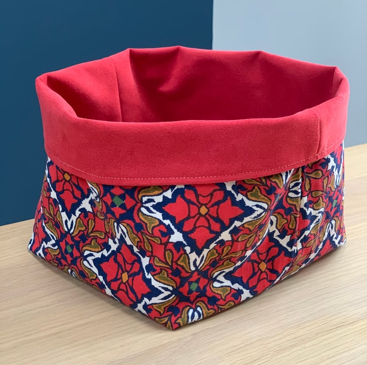 Reversible fabric basket made from soft red faux suede and striking vintage cotton in a geometric print. Can be used with a turn-down to make the most of the contrasting fabrics.